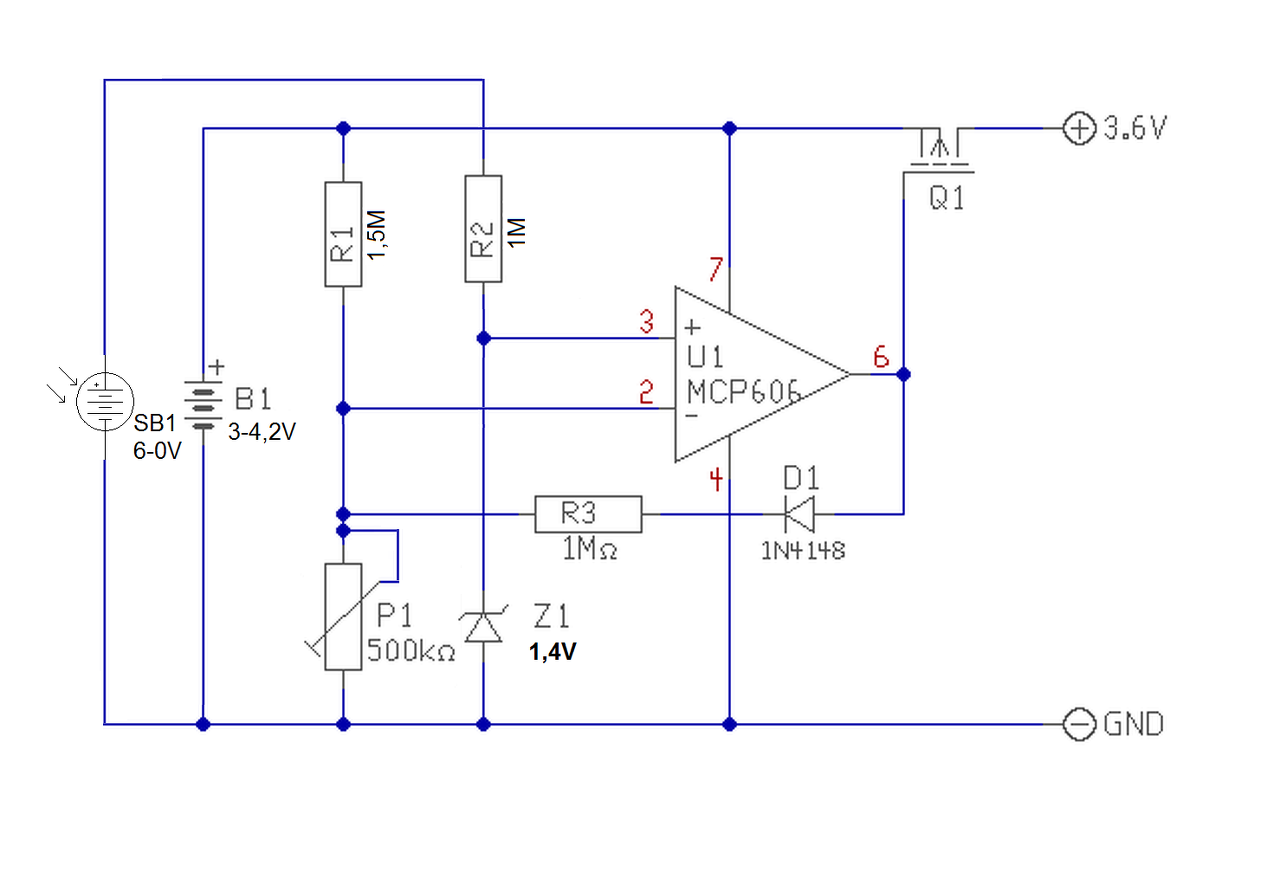 A napelem akár 6V leadására is képes, így a Z1 az opamp bemenetét védené a túl nagy feszültségtől. Én egy 1,4V-os Z diódára gondoltam, nem tudom hogy ez volna-e a legideálisabb erre a célra.