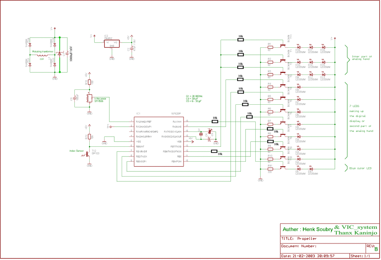 Elnézést, teljesne igazatok van. Csatoltam a bekötéseket és a nyákrajzokat is. A LED a forgó részen villan ki, nem a bázison. A programot innen szedtem, az eredetit: Bővebben: Link