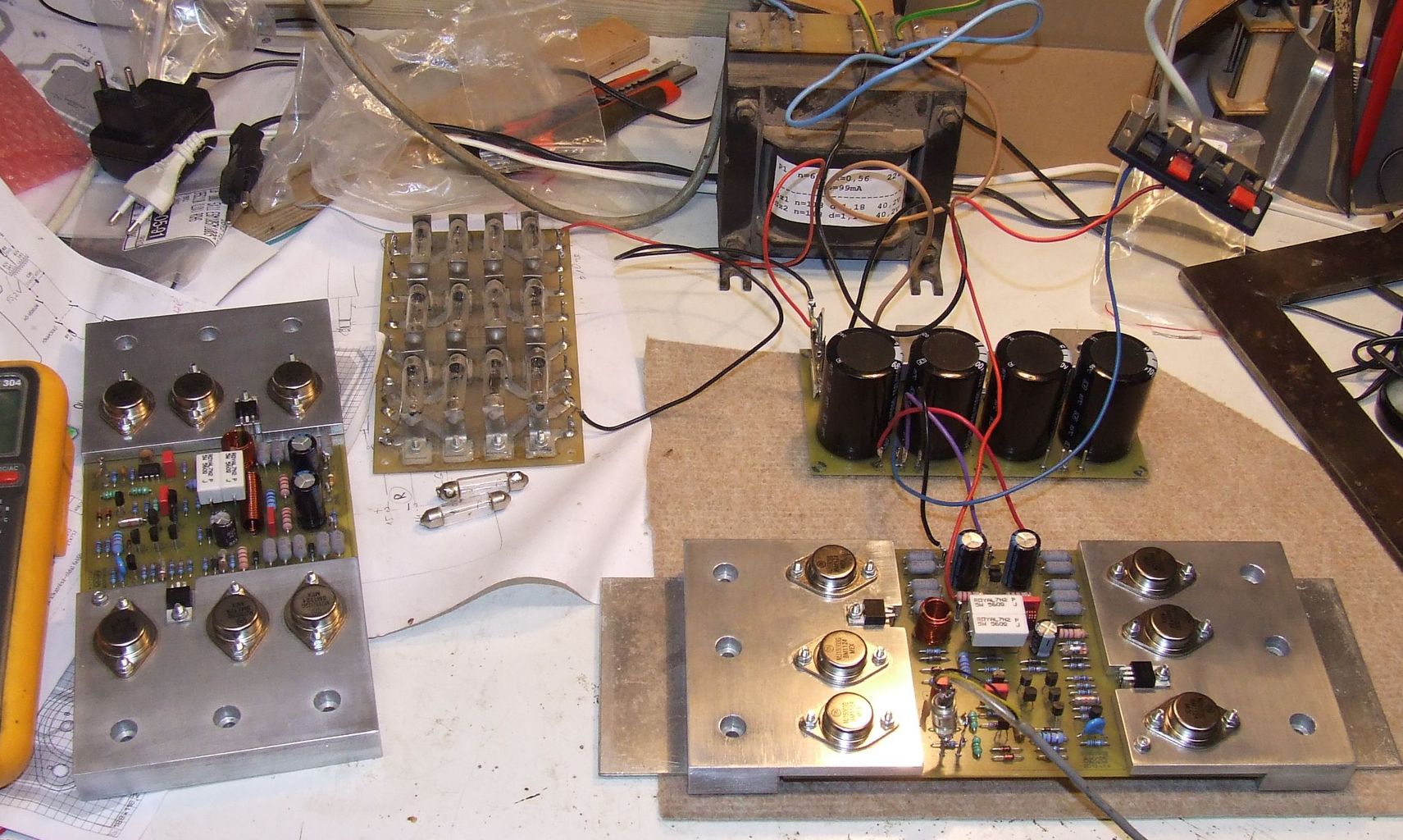 Tavaly láttam egy román srácnál kétféle nyák kialakítást, az egyik hosszú volt és minden tranyó egy sorban volt rajta, a másik hasonló ehhez, de nem a nyák mellett voltak a tranyók (műanyag tokosak, MJL-ek) hanem alatta, tehát közvetlenül egyetlen összefüggő hűtőfelületre szerelhetően, minden idom vagy fül közbeiktatása nélkül. Nem volt nálam még a telefonom sem hogy lefényképezzem, meg annyira nem is érdekelt. Ha esetleg érdekel csinálok róla egy skiccet hogy hogy nézett ki.