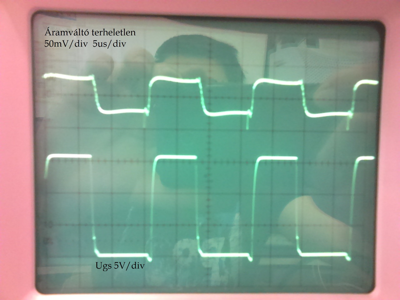 A trafó adatai: L mágnesező: 4.14 mH Lszórás: 68.8 uH Rezonáns kondi értéke: 94 nF Számolt rezonancia: 62.5 kHz A tápot sikerült rezonanciára állítani. (A névlegesnél 2-szer jobban leterheltem max feszültségig állítva a kimeneti feszültséget a kapcsoló frekivel.) Lenne pár kérdésem. A miller platót hogyan lehet eltüntetni a gate jelből? Valószínű, hogy nem 0v körül kapcsol ezért van ott. Próbáltam feljebb tekerni a kapcsoló frekit is de nem volt rá hatással. Adjak a trafónak egy kis légmagot.Most nincs benne. Az áramváltón terheletlen állapotba négyszöghöz hasonló jelet kaptam. Itt nem fűrész jel kéne hogy legyen? Felrakok pár képet a mért jelalakokról bocsánat a minőségért a telefon erre volt képes. Terhelt állapotban olyan 70 wattal terheltem. A végső beállításhoz szeretnék tippeket kérni. Előre is köszönöm a válaszokat.