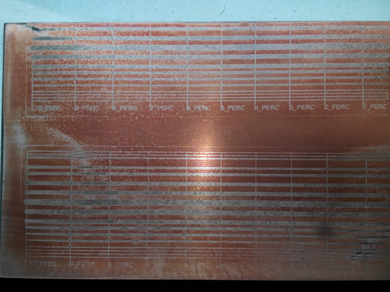 A film jó volt. Írásvetítő fólia két rétegben. Az előhívóval akadtak gondjaim, szi-ti lefolyó tisztító púpos adagolókanállal + fél liter meleg víz. Elsőre 2-3 másodperc alatt megsemmisítette a túlvilágított panelt, így e csatolt képen lévőt úgy hívtam elő, hogy az előbb említett keverékhez adtam még fél liter vizet, hogy kicsit lassabb legyen a folyamat. Így lubickolt 1-2 percet, addig, amíg a vezetősávok láthatóakká nem váltak.