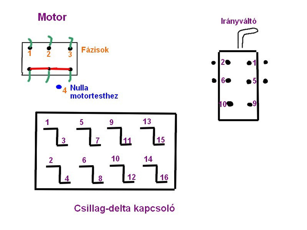 Akkor ezek szerint a csillag-delta kapcsoló nem jöhet számításba; akkor marad az irányváltó bekötésének kérdése.