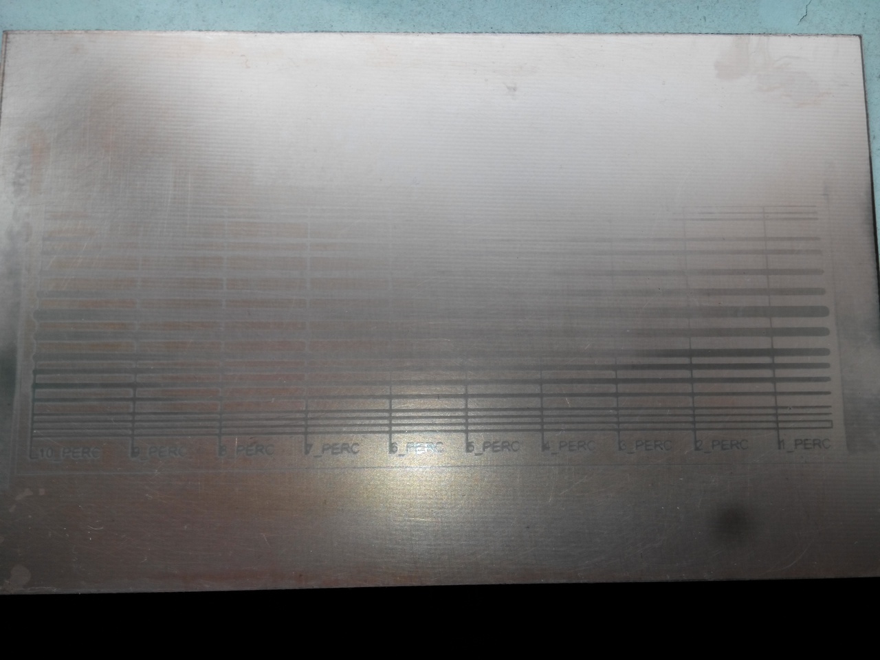 A film jó volt. Írásvetítő fólia két rétegben. Az előhívóval akadtak gondjaim, szi-ti lefolyó tisztító púpos adagolókanállal + fél liter meleg víz. Elsőre 2-3 másodperc alatt megsemmisítette a túlvilágított panelt, így e csatolt képen lévőt úgy hívtam elő, hogy az előbb említett keverékhez adtam még fél liter vizet, hogy kicsit lassabb legyen a folyamat. Így lubickolt 1-2 percet, addig, amíg a vezetősávok láthatóakká nem váltak.