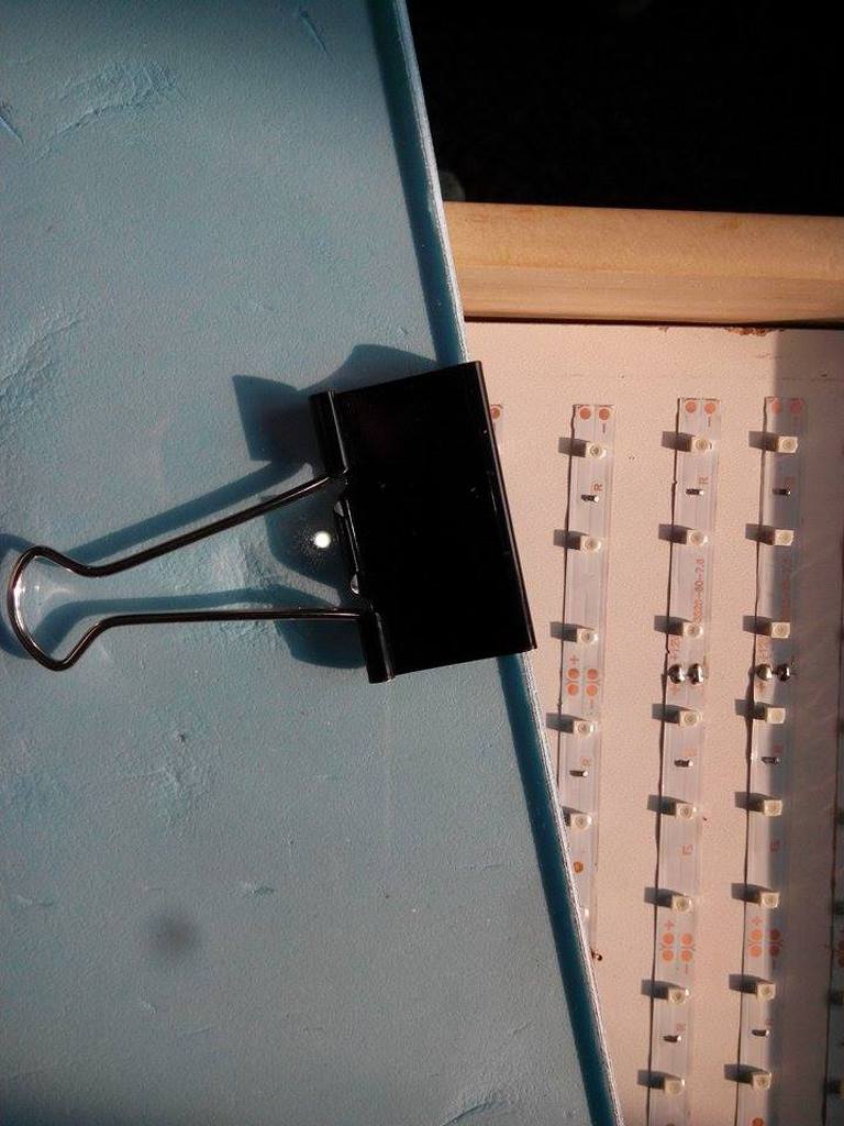 A ledek-et tartó lapot hátrább tettem amennyire csak lehetett, kb. 6cm van az üveg és a ledek között. Irat összefogó -val szorítottam össze az üvegeket mind a négy oldalán.