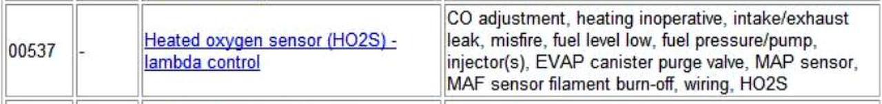 „CO beállítás, fűtés nem működik, elszívó / leeresztő szivárgás, gyújtáskimaradás, az üzemanyagszint alacsony, az üzemanyag nyomás / pumpa, injektorok), EVAP tartály leürítő szelep, MAP szenzor, MAF szenzor izzószálas égessük le, HO2S vezetékek”