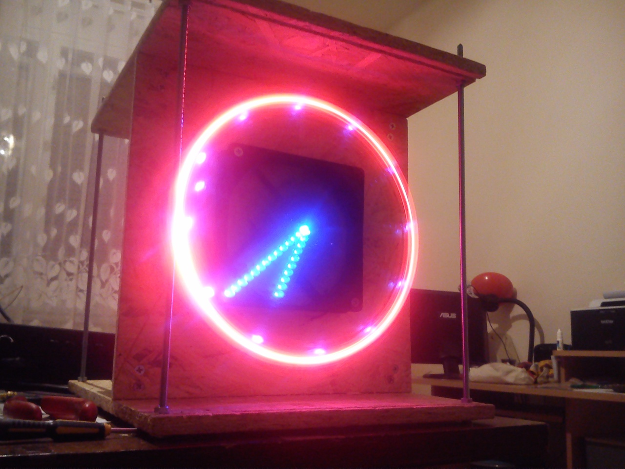 Hát egyelőre szétbontom, és majd holnap egy falapra felerősítve fix mágnessel újból nekiesek, nehogy véletlen valami beleakadjon a rotorba. Még azt a villogást nem tudom hova tenni, de lehet csak az RTC hiánya okozza, hogy egyelőre nem tudja hány óra van délbe?!