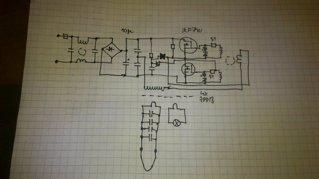 A szorosabb csatoláson gondolkodtam de az 1 menetes kb 100 réz szálból álló szekunder tekercset nehéz kivezetni ha felette van még primer. Kondik vannak benne, kb 20 x 1 uF, azért kellett ilyen sok mert nagyobb kapacitású kevesebb darab elégett volna.