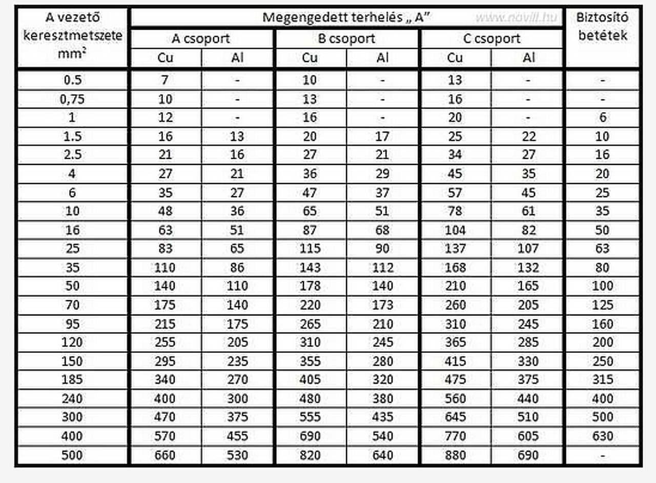 Ha alaposan megnézed a táblázatodat, akkor kiderül, hogy a vezeték terhelhetősége és keresztmetszete között egyenes arányosság van.