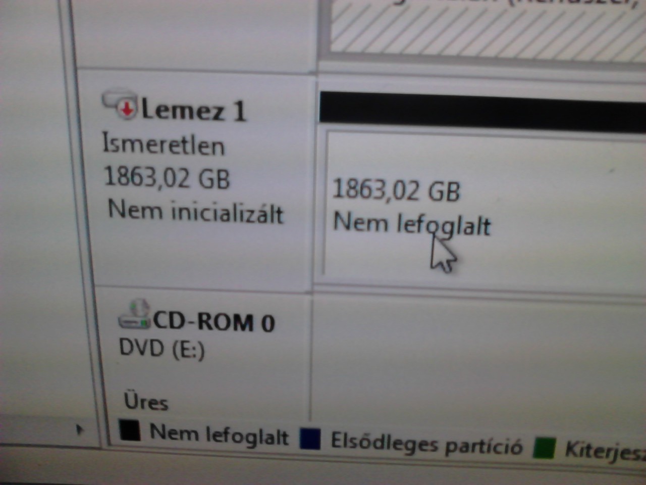 Ha csak használni akarod, akkor először jobbklick a baloldali kisebbik ablakon (ahol inicializálatlannak jelzi), lemez inicializálása, - ezután jobbklick a jobboldali hosszabbik sávon, új partíció létrehozása, formázása és kész - használható. Ebben az esetben minden rajta volt adat elveszik róla!!! Ha az előzőleg rajta levő adatok is kellenének, az bonyolultabb, menteni kell ami mindig kétesélyes dolog. Első nekifutásra próbáld meg ezzel. Minden feltett kérdésre a pontos választ kell megadni, inkább ellenőrizd kétszer!