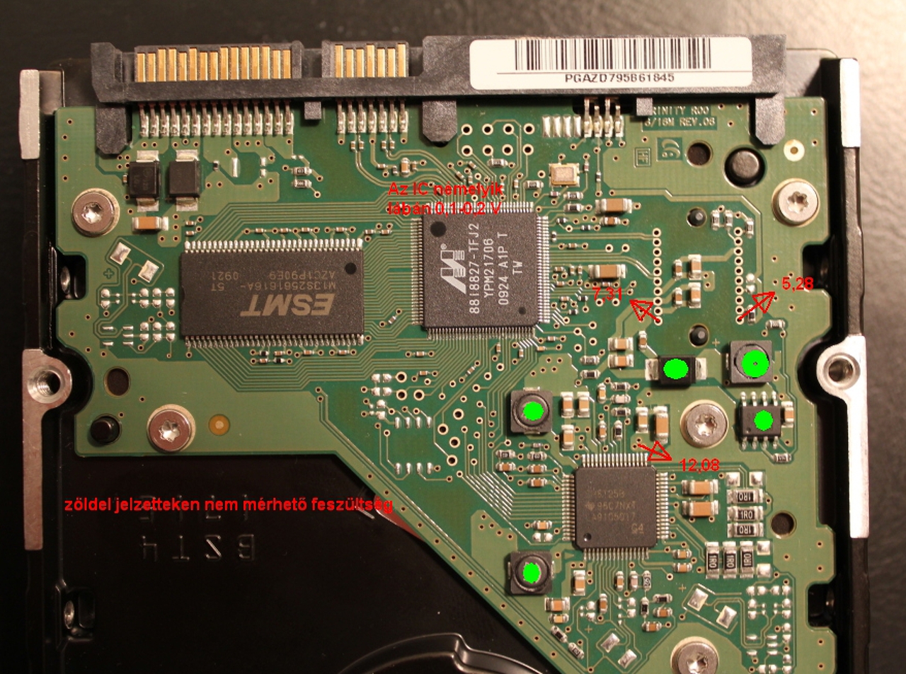 Az esti kérdésem igencsak elhamarkodott volt! Mentségem nincs, annak ellenére, hogy egy külföldi fórumban talált kép alapján tettem fel. Az a "mákszem" egy igen magas (200Mohm felett) értékű lehúzó ellenállás lehet és nem ott van a baj. -A baj ott van, hogy azt se tudom, hol keressem a bajt!- A baj pedig az, hogy a hdd fel se pörög. A képen jelöltem pár mérési eredményt. Jó tippet, segítsé- get köszönettel veszem! A Marvel-ha jól tudom-IC-n lévő felirat: " Az IC némelyik lábán 0,1-0,2 V" A hozzászólás módosítva: Márc 14, 2015