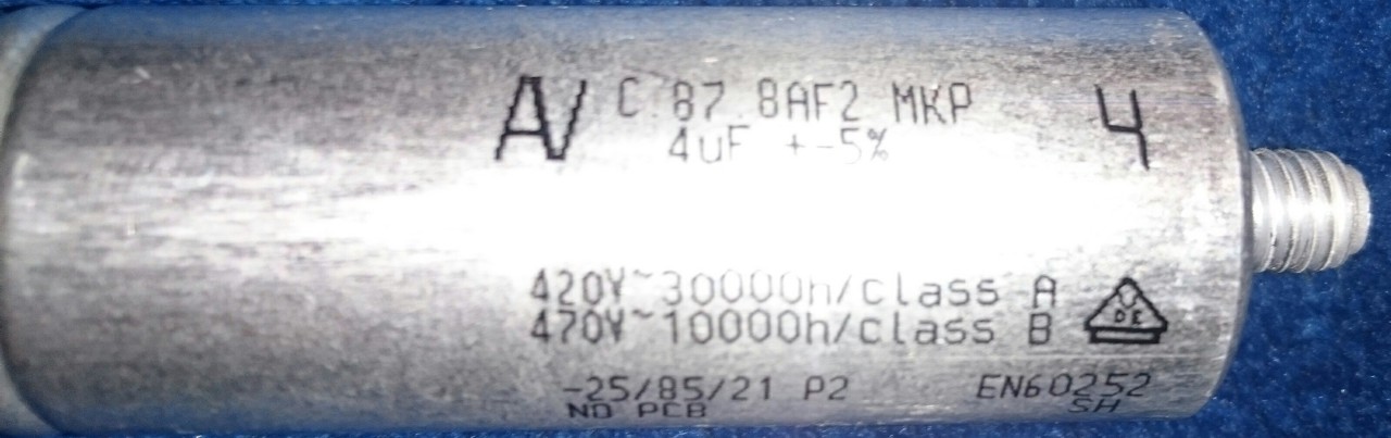 Mosogatógépben szeretnék motor indító kondenzátort cserélni. Mellékletbe csatoltam képet a hibás kondenzátorról. Sajnos adatlapot nem találtam sem a kondenzátorhoz, sem a mosogatógéphez. A kérdésem az lenne, hogy 450V-s kondenzátorral helyettesíthetem-e, illetve ha nem, akkor mi lenne az a legkisebb feszültség, amit a kondinak el kéne bírni? Előre is köszönöm! Üdv.: Bence