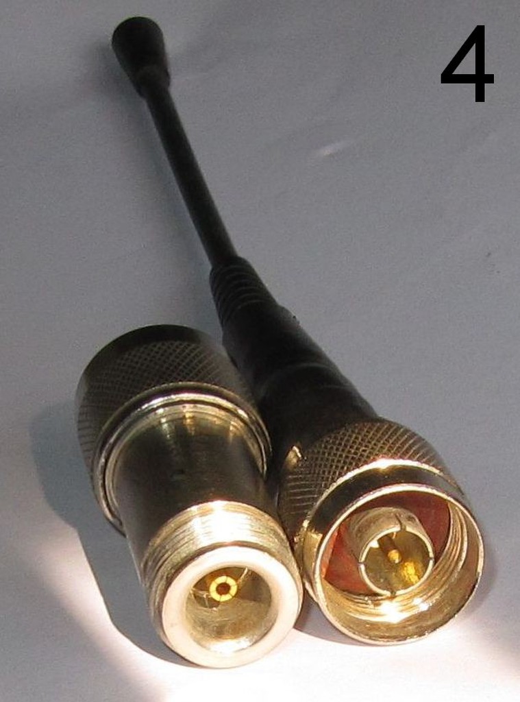 Az 1 képen lévő antenna nem működik. Hossza a fémvégtől 15cm. A kábelvég aljzat egy fekete vaslemezen van (talán RF ellensúly), ez és az antenna között van valami közdarab, gondolom illesztő lehet. 2-es képen a kábelvég alzjat, és az illesztő ide jövő csatlakozója. Középső csatlakozójuk hiányzik, kiszakadt. 4-es képen a közdarab és antenna csatlakozó van. Gondolom ugyanilyen csatlakozó lenne a 2-es képen lévő is, mint a 4-es képen. Ezek a csatlakozók pont úgy néznek ki, mint az " N " csatlakozó, nem tudom létezik-e hasonló, amivel összetéveszteném.