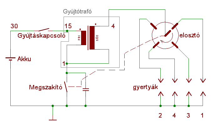 Többször volt már ilyen kérdés, összedobtam egy "rajzot", hátha más is keresné. Alap, megszakítós rendszerbe való bekötést mutat, elektronikusnál a megszakítót jeladó és kapcsolóelemek váltják föl. Illetve, motorokon olyan megoldást is alkalmaznak, hogy több szekunder kivezetés van, és a gyertyákon keresztül nem a testre, hanem a szekunder másik ágára záródnak a körök, lényegében két gyertya van sorba kötve a szekunder ággal.