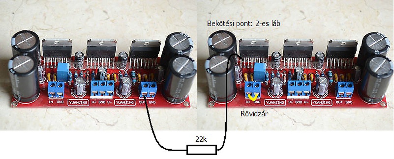 A hangszórót a két OUT jelű kimenetre kell kötni, tehát nem kap GND-t. A 22k ellenállás ne zavarjon, ráforraszthatod a panel aljára is. Mehet a 4 ohm.