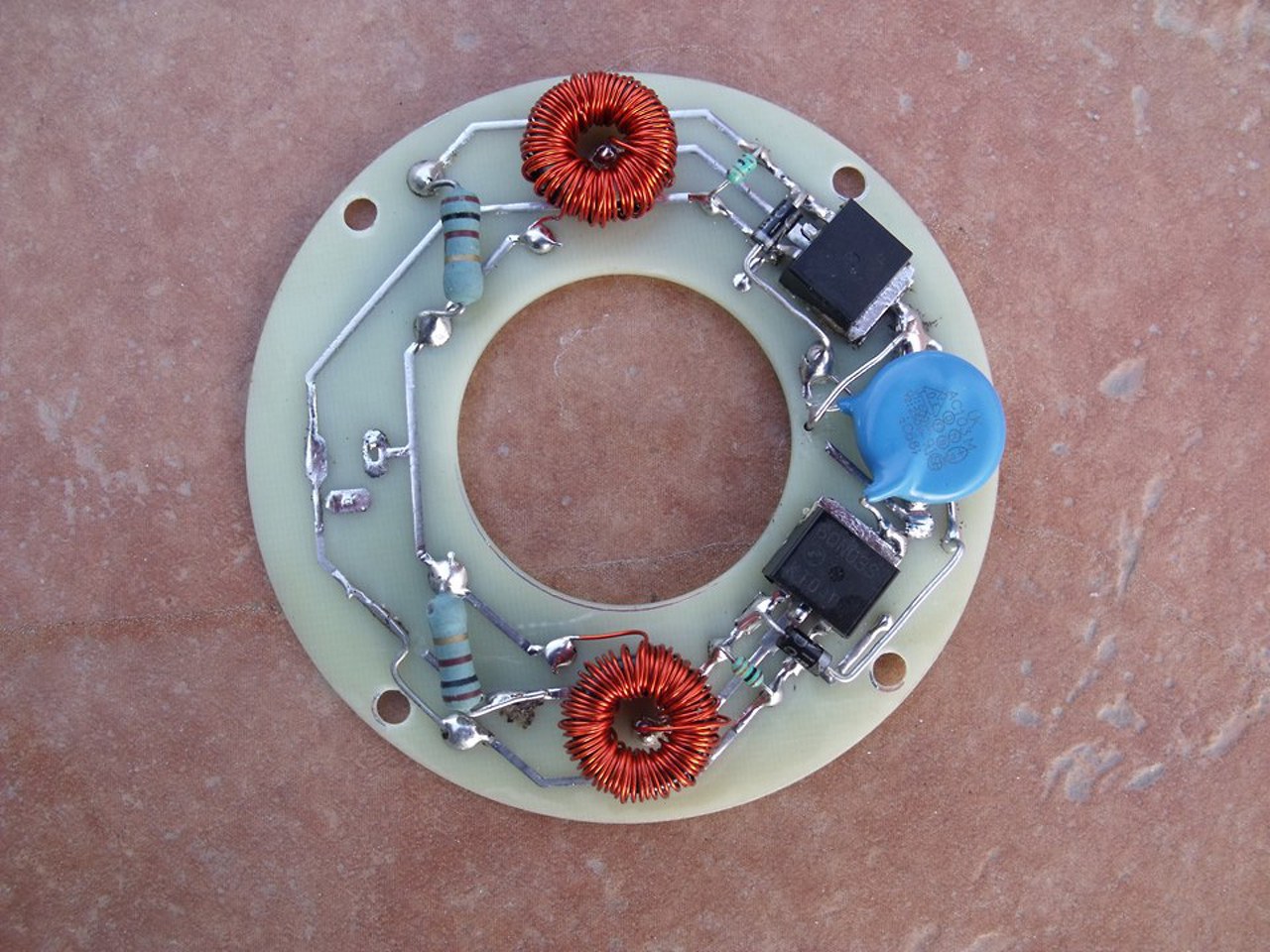 Ezt az ebay -ost kéne kipróbálni mert szerintem könnyen másolható és egyszerűnek tűnik. Rá lehetne tervezni a bázisra és a rotora is így csak a tekercsek kellenek és azonnal működne nem kéne kondikkal hangolászni.