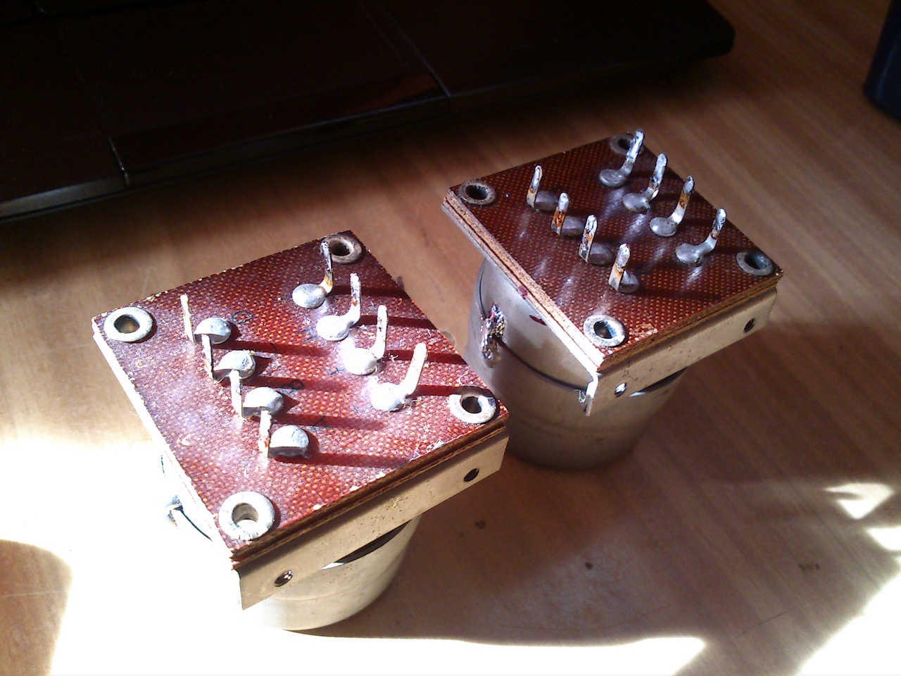 Ugyanilyenek az illesztőcsévék. 150,300,600 Ohmos vonalak illesztéséhez lehetett használni - földkábelekhez, vagy légkábelekhez. Mivel a telefonvonalak jellemzően 600 Ohmosak, az illesztett csatoláshoz mindenképpen kell 600 Ohmos cséve. A másik fele már lehet vagy szintén 600, vagy 300, vagy 150, de akár 1200 Ohm is. Telefonkábel rendezőkben, telefonközpontokban sok ilyet használtunk. Itt az asztalomon is van egy, igaz az hiperszil magra készült, ezért át is alakítottam magamnak táptrafónak.