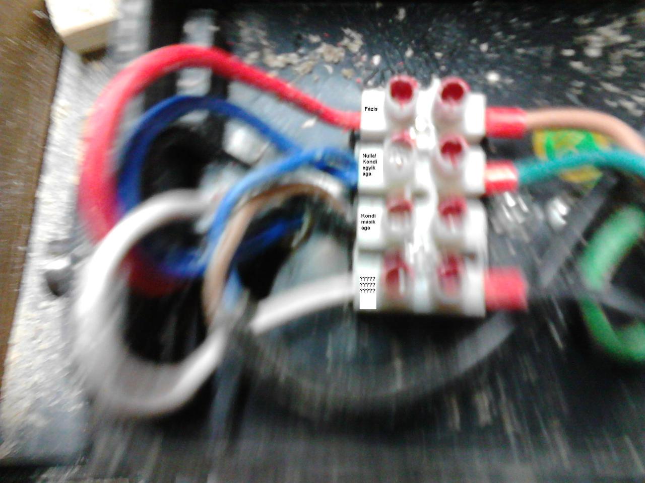 Értem!De ezen a felső piros és az alattalevő kék a fázis és N.Az alatta lévő fekete a kondi egyik ága.A másik a kékre volt kötve.Na és ez alatt van egy fehér ami nem tudom hogy mit szolgál.A nyomogomb dobozán van egy rajz.Kicsit rossz a fotó,de a jobboldali alsó felirat a fehér.