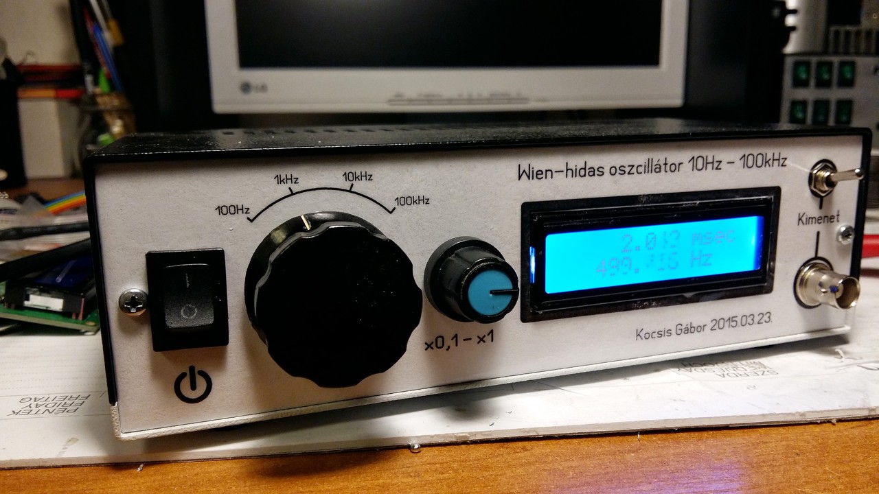 Készült egy wien-hidas oszcillátor, egy frekvenciamérővel kiegészítve. 10Hz-től 100kHz-ig állítható 4 fokozatban. Reményeim szerint egy cikk is meg fog jelenni róla itt az oldalon.