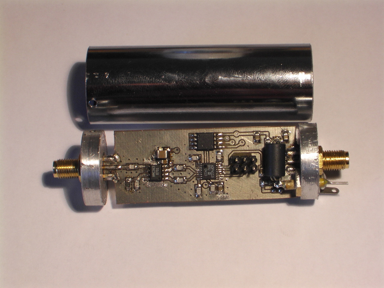 A bemenő frekvencia tartománya 1 - 12 GHz, de az érzékenység rovására le lehet menni 100MHz alá is. A kapcsolás első fokozata egy HITTITE gyártású, 13GHz határfrekvenciájú, HMC363 tip. IC, ami nyolccal oszt. A következő IC egy PLL áramkör, aminek a 2,5GHz-es határfrekvenciájú programozható osztója további 125-el osztja a frekvenciát, így a teljes osztás 1:1000, ami a max. bemeneti frekvenciát 12MHz-re szelidíti. A PLL áramkört egy ATtiny13A microcontroller állítja be a kívánt osztásra. Az alábbi képeken a szerelt nyák és némi forgácsoló munka eredménye látható: