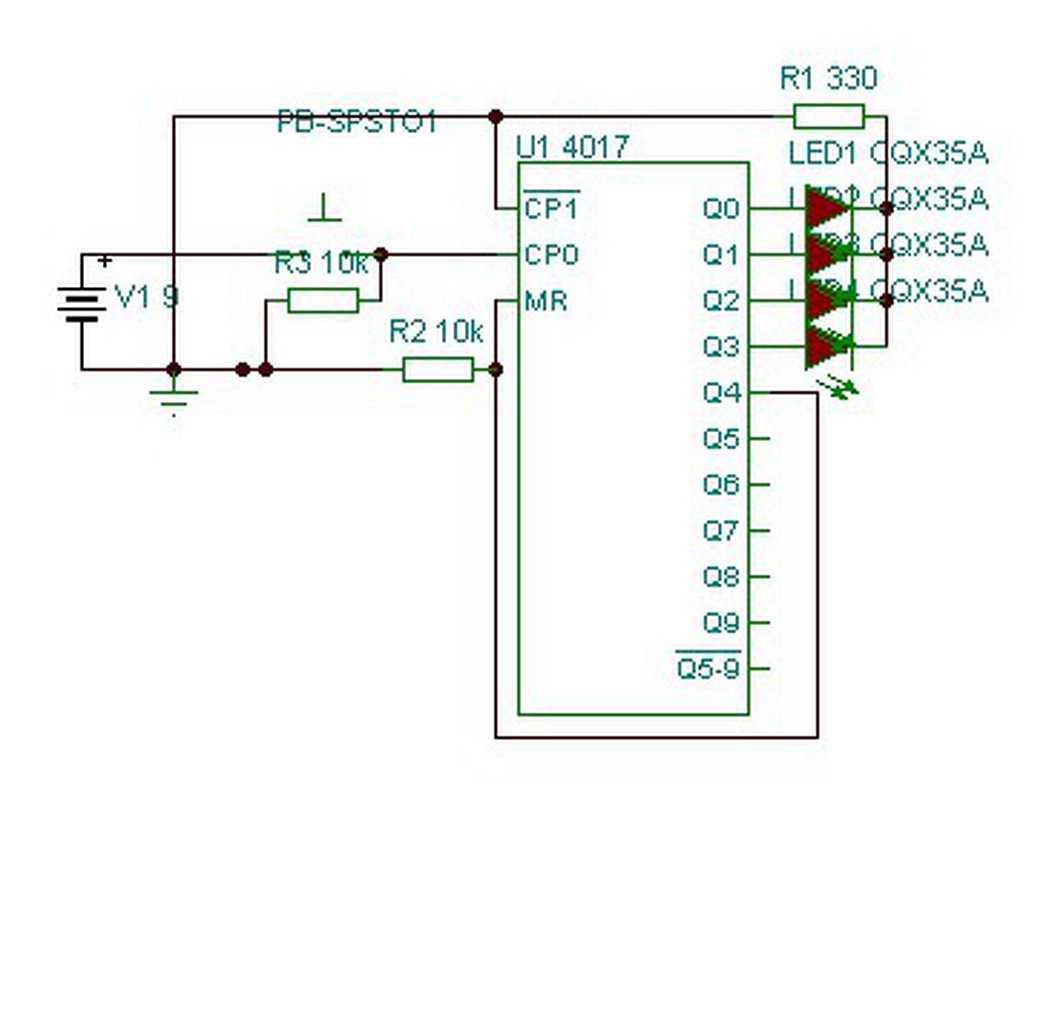 A 4017-es magas szintről alacsonyra váltáskor kapcsol. Ha egy nyomógombbal adjuk a tápfeszt akkor egy 10K ellenállással a GND-re kell kötni a clock bemenetet. Ha megnyomjuk a gombot tápfeszt kap ha elengedjük az ellenállás lehúzza GND-re és kapcsol.
