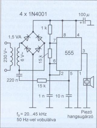 Aztán jött ez az áramkör . Ezt a kapcsolást részletesen megtalálod ezen az oldalon . Ebből működik felváltva kettő, a terménytárolóban, más más frekvencián. Nyestek ellen ezt építettem meg, ez nagyon hatásos riasztó. A nyáktervét meg a kisebb módosításokat a forumban megtalálod. Olvasgasd végig, hasznos. Ez utóbbiból tervezek építeni még egyet, ha időm engedi