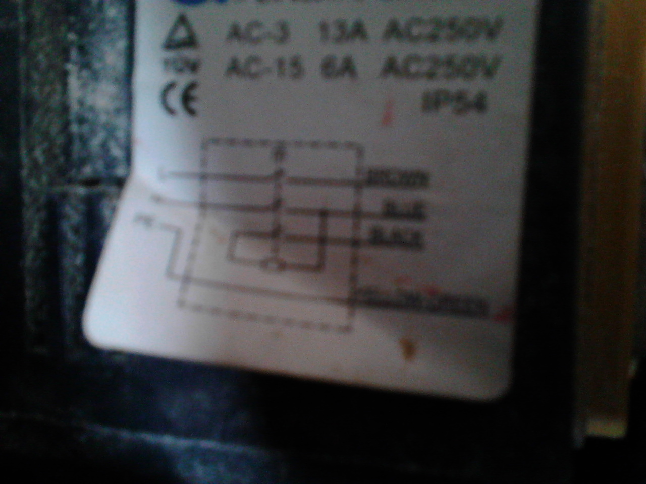 Értem!De ezen a felső piros és az alattalevő kék a fázis és N.Az alatta lévő fekete a kondi egyik ága.A másik a kékre volt kötve.Na és ez alatt van egy fehér ami nem tudom hogy mit szolgál.A nyomogomb dobozán van egy rajz.Kicsit rossz a fotó,de a jobboldali alsó felirat a fehér.
