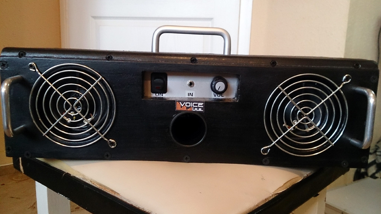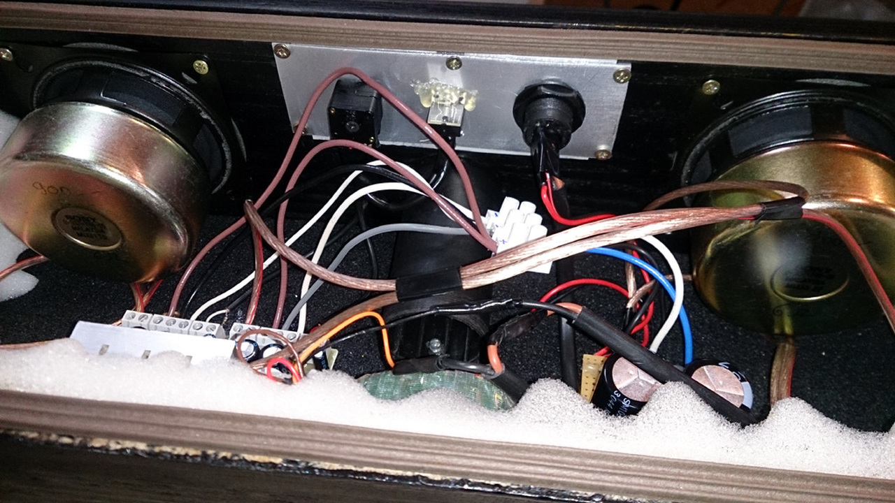 Amúgy meg türelmetlen voltam, és kerestem a megfejtést... Íme pár kép a kis cuccosról...belátom, hogy nem szép kivitel, főleg nem gyári, de elsőre ilyen lett. Rendes asztalosmunkával persze jobb is lehetne. A holland Thodio volt az ihlető, pofás, de borzasztó drága cuccokat gyártanak manufakturális jelleggel, nem túl nagy példányszámban. 250-től 650 Euro-ig mennek az árak...nem a mi pénztárcánknak való...mondjuk TDA1562Q-s végfokok vannak benne, asszem' Polk Audio hangszórókkal, meg persze Bluetooth. Eredetileg én is szántam bele egy BT-modult, de sajnos még nem jött össze. A kínai kis panelhez (kb. 3x1cm méretű...) kéne valami kifejtő rész (tüskesor?), amire rendesen lehet forrasztani. Meg persze stabil 3,6-4,5V-ig tápfesz neki. Szóval csak 3,5-es jack line-in van egy kopasz 50K-s hangerőpotival. Nálam 2db TDA2030A megy +-13V-ról 6 ohm-ra (olyan 2 x 10W lehet). Fogalmam sincs mennyit bírnak a kis Sony hangszórók...de becsületesen szólnak így vele. Végül a nyers előlap-verzió helyett tettem rá védelmi okokból két ventilátor rácsot...hamm indusztriális lett amúgy is a "majrévasakkal"...:o) Lányomnak csináltam a mobiljához. Megőrülök, mikor möcögtetik a telefon hangszórójával, akkor inkább dugja rá erre, mindjárt rendesebben megszólal. Nem két külön kábeles izé, mint egy aktív speaker...jobban tudja ide-oda vinni. Olyat akartam, mint a mi időnkben egy rádiósmagnó volt...vagy majd egyszer csinálok nagyobb verzióban, mint a ghetto-blaster igazi kazettás nagy rapper boomboxok voltak....