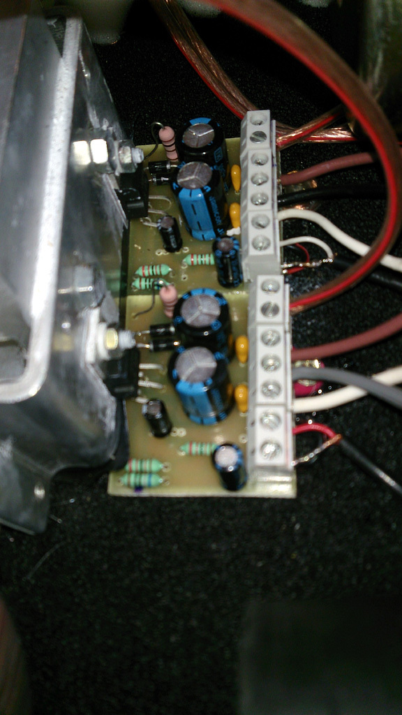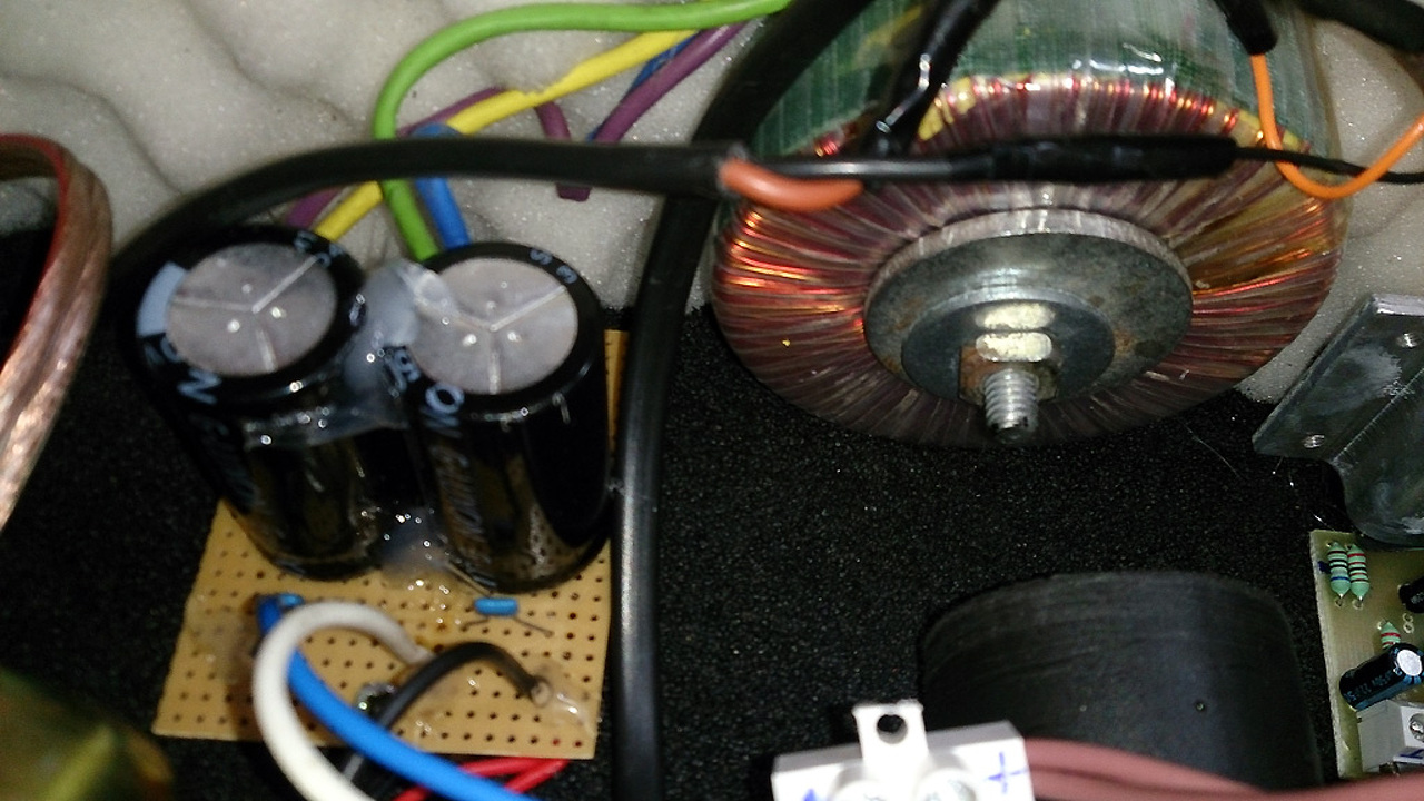 Van kaotika, jól tudom...sajnos adottak az elhelyezési lehetőségek egy ekkora ládikóban. Gyáriakban is őskáosz szokott uralkodni, mégsem ilyen zajosak (OK, Kína ne legyen etalon)... Közben kipróbáltam, hogy direktben bekötöttem egy másik kis-jackes árnyékolt kábelt a panelek bemenetére. Borzasztóan hangos zaj-búgás, minden jel nélkül is! Taperolásra erősödik a sistergés (kondik, borda és egyebek). Tápot ellenőriztem, kiszedtem a trafót, távolabb tettem, átnéztem a Graetz-es, pufferkondis panelt, látszólag OK. 3A-es híd, 2x4700µF/50V, majd II-osan 2x47nF. AC-t nem mérek a kimeneten. A már leírt aszimmetria még terheletlenül is megvan (3-4 tized volt), terhelésre a pozitív jobban visszaesik. Hát egyelőre ennyi.
