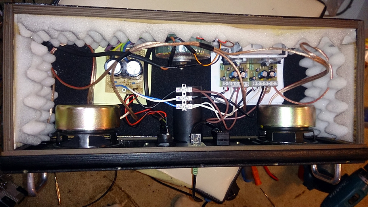 Most, a szintén Mikroshop-os kitekből összerakott két 2030-as panelből gyártottam egy kis zenedobozt. Aktív speaker jellegű lévén elég sok probléma van a dologgal (amatőr kivitelezésnél hasznosabb szerintem különválasztani az erősítőt a hangfal résztől...én is sokat szenvedtem azon, hogy a doboz jól záró legyen illetve ne jöjjenek rezgésbe a belsejében az elektronikai részek, stb...). Amúgy teszi a dolgát rendesen, szól - ha van zene egészen jól! Egy 2x9V-os toroid trafóról kapja a naftát, ebből úgy +-13V körül lesz. A két kis (8,7 cm-es mindössze, óriási mágnessel) 6 ohmos Sony hangszóróval (LOMEX-es) adatlap szerint úgy 10W jöhet ki csatornánként... ha rendesen felteszem a doboz fedelét, akkor megjönnek a mélyek is (annak ellenére, hogy két ekkora membrán nem sok levegőt képes megmozgatni, de tettem a cuccba egy eléggé ad-hoc reflexcsövet...). Szóval ami zavar, az egy rettentően hallható sistergés és egy 50Hz-es brummnak tűnő szösszenet keveréke, amely nagyon zavaró a műsor közti csendben vagy ha nincs bemenő jel. A dolog nem világos, mert asztalon összerakva "deszkamodellen" még semmi ilyesmi nem volt vele. Az előző erősítőnél sem tapasztaltam ilyen durva dolgot. Mondjuk ott fémdobozban volt, meg külön voltak a hangládák...de ott sem volt irodalmi a vezetékezés, meg a belső rend - mégsem volt csak egy alig észrevehető alapzaj a hangerőpoti max. állásában. Sajnos túl nagy a telefonnal készült videó (23 mega), így nem tudom megmutatni, miről is van szó (talán ha tudnátok valami lehetőséget ilyen nagyobb fájlok feltöltéséhez, belinkeléséhez).... Ha feltekerem a hangerőpotit, a hangszórók már szinte elszállnak....kézzel tapogatásra (pl. kondik teteje, hűtőborda) is változik ez a sistergés....ha sokat izélgetem nagyobb hangerőn, be is búg (gerjed a cucc)... Mit ronthattam el? Próbáltam már pár dolgot összeföldelni, de semmi. Árnyékolt kábel megy a bemenő jack-től a hangerőpotin át a panelekig. A táp kissé aszimmetrikus (2db LED-et kötöttem a +-ra, talán azért?), 12,9-13 körül a pozitív, -13,3 a negatív ágban. A hangszóróföldek a pufferkondis panelre mennek közvetlenül. Előre is köszönöm, üdvözlettel: Péter