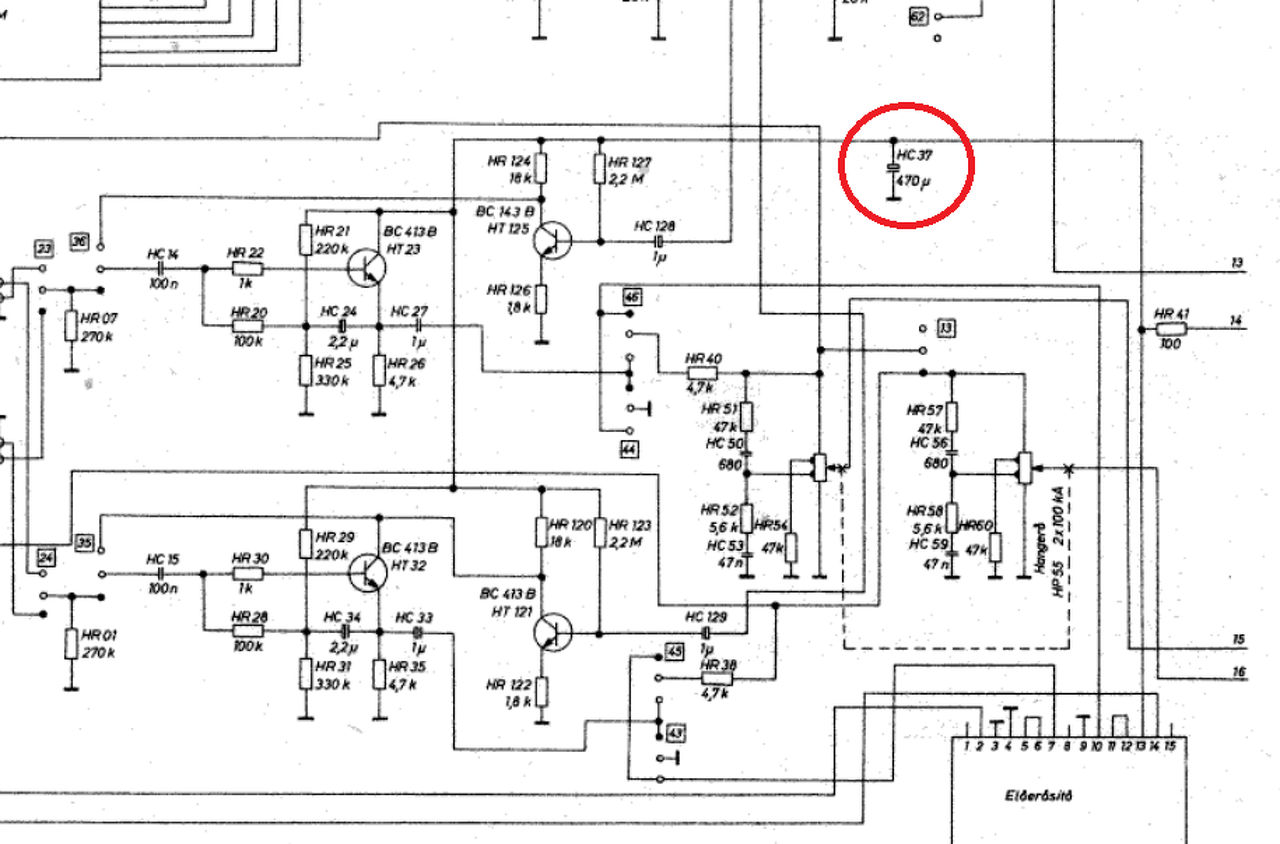 Lehet, hogy a probléma még előrébb lévő fokozatból indul ki.... A bemenő fokozatok és az előerősítő modul egy 100 Ohm/470µF RC tagon keresztül (HR41, HC37) kapják a tápfeszültséget abból a tápból, amit a végfok megrángat(hat). Az összes kisjelű fokozat erről az RC tagról van táplálva, ez okozhat gondot. Tegyél már pluszban egy 470µF -os kondit a HC37 -re és úgy próbáld ki. Akár egy előzőleg cserélt kondit is ráakaszthatsz, nem kell új. 35V -os legyen minimum. Valahol az alaplapon lesz a kondi, hagyd benne az eredetit is, pluszban tegyél rá még egyet. Van még két kondi, ami a tápfeszültséget szűri, de azok a nagy tápfeszültségen vannak, párhuzamosan a nagy elkóval, csak helyileg az alaplapon. Azok hibája esetleg lehet, de én inkább az előbbire gyanakszom. Méghozzá arra, hogy nem rossz, hanem kevés. Nincs elég szűrés. Bejelöltem ezt a másik kettőt is a második rajzon. A hozzászólás módosítva: Ápr 9, 2015