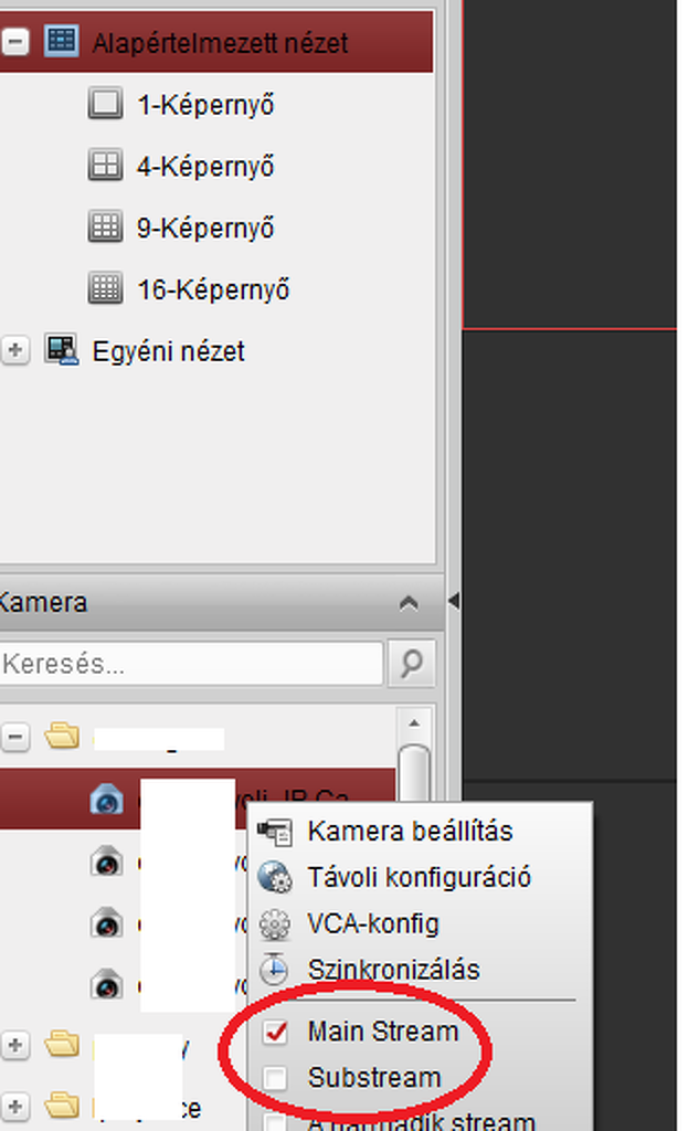 A substream kisebb felbontású, ez kevésbé terheli a gépet. Elvileg a gyári beállítás szerint 9 vagy több kamera együttes megjelenítésekor átvált az IVMS substreamre. Ha kiveszed az automatikus váltást az Eszközök->Rendszer menüpontban, (1. melléklet) akkor az általad beállított streamet fogja használni. Streamek közt úgy tudsz váltani, hogy a fő nézetben a kamera nevén jobb klikk... (2.melléklet.) Üdv.