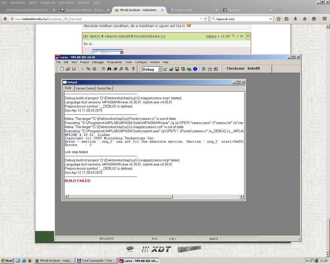 Egy olyan problémám lenne, hogy adott egy ASM és INC fájl amiből szeretnék csinálni egy HEX fájlt, viszont az MPLAB progiba el jutok odáig hogy meg csinálom a projektfájlt, be is importálja a 3-om darab fájlt, viszont amikor a hex fájlt akarok készíteni belőle akkor ezt a hibaüzenetet dobja ki nekem: Make: The target "D:\Elektronika\hajó\uj\Forrás\caresc.o" is up to date. Make: The target "D:\Elektronika\hajó\uj\Új mappa\caresc.cof" is out of date. Executing: "D:\Programok\MPLAB\MPASM Suite\mplink.exe" /p12F675 "..\Forrás\caresc.o" /u_DEBUG /z__MPLAB_BUILD=1 /z__MPLAB_DEBUG=1 /o"caresc.cof" /M"caresc.map" /W /x MPLINK 4.30.01, Linker Copyright (c) 2009 Microchip Technology Inc. Error - section '.org_2' can not fit the absolute section. Section '.org_2' start=0x00000004, length=0x000007ec Errors : 1 Link step failed. ---------------------------------------------------------------------- Debug build of project `D:\Elektronika\hajó\uj\Új mappa\fd.mcp' failed. Language tool versions: MPASMWIN.exe v5.30.01, mplink.exe v4.30.01 Preprocessor symbol `__DEBUG' is defined. Sun Apr 12 02:27:08 2015 ---------------------------------------------------------------------- BUILD FAILED Lenne valakinek valami ötlete?