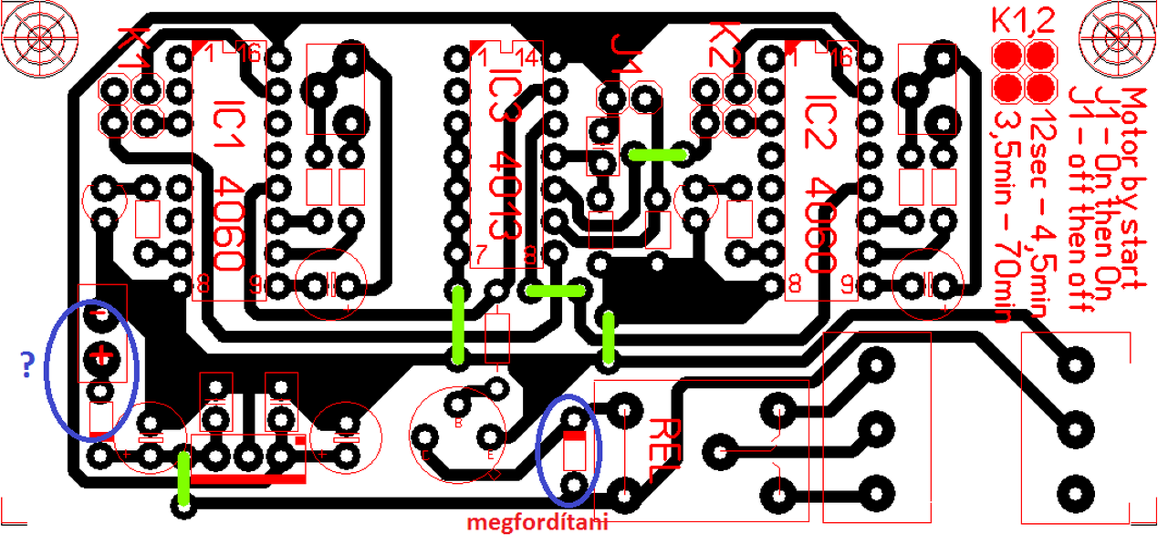 Néhány helyen túl kicsi a távolság (táp IC, relé fölötti átkötés), nem tudom milyen verziót használsz, de van DRC ellenőrzés is. Én elforgatnám a tranzisztort is, és végiggondolnám hogy szeretnéd a potikat állítgatni, nehogy az IC-k útban legyenek. Ha magam csinálom a nyákot nem szoktam ekkora furatokat csinálni, még akkor sem, ha végül ekkorára fúrom is.