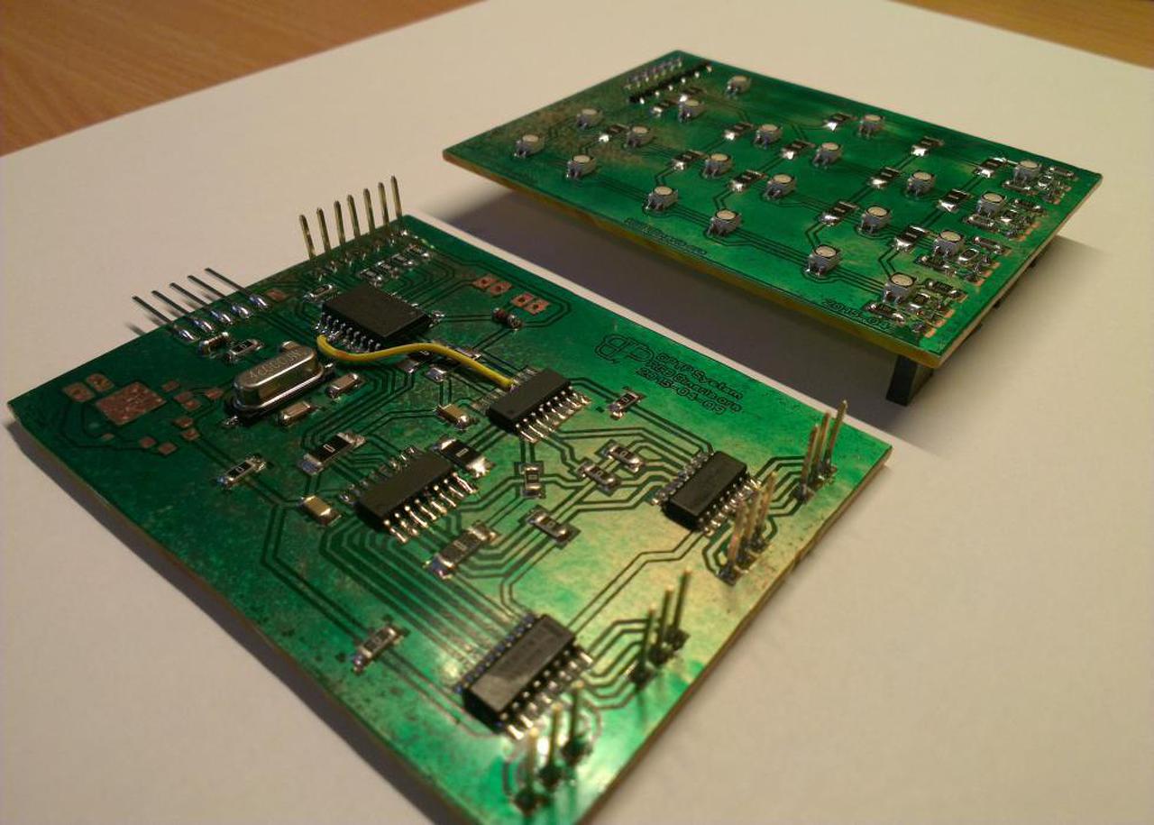 Itt is mint az előzőnél 16F628 PIC-el készült a kapcsolás, de ezúttal megtámogatva 2db 74HC595 és 2db ULN2003-as IC-ékkel.