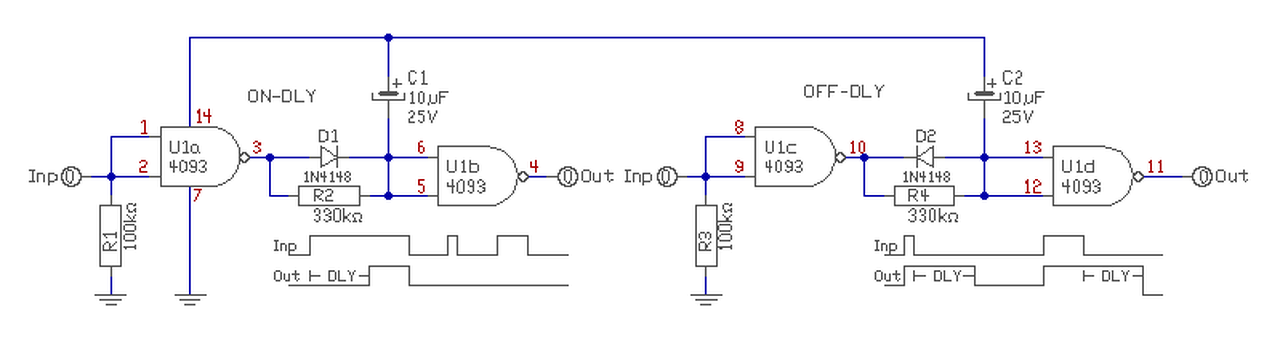 Köszönöm a gyors választ! Ebben a kapcsolásban gondolom a c1 el tudom az időzítés hosszát beállítani? Esetleg tudnál még egy hasonló problémában segíteni? A kapcsolás amit készítek lenne még egy hasonló időzítő ahol a működés a következő: Ha a bemenete log 1 lesz akkor a kimenete a beállított késleltetés után (szintén 3sec) lesz log 1 és bekapcsolva marad addig amig a bemenete nem lesz 0 ebben az esetben ha megint 1 lesz a bemenet késleltetve ismét bekapcsol.