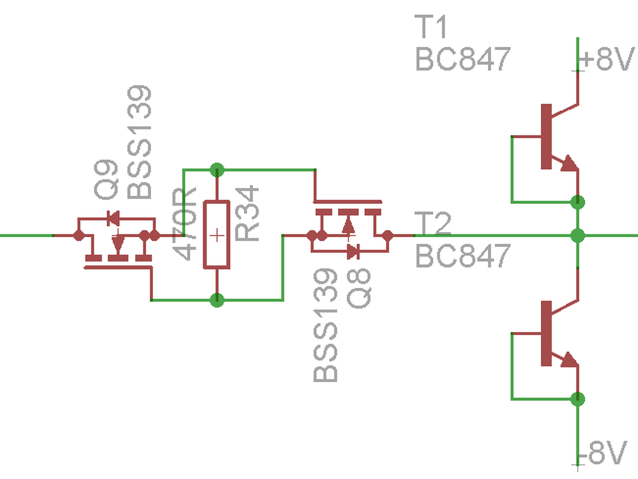 Nekem meg kiürítéses(depletion mode) kell. Az áram nem fontos, max 4-5 mA menne át rajta, a feszültség már fontos(250V). Amihez kell: passzív védelem mérőműszerhez. Jelenleg két BSS139 van bekötve ellenütemben, és ha áram folyik az ellenálláson akkor a polaritástól függően vagy az egyik, vagy a másik FET lezár. A két NPN tranzisztor diódaként viselkedik. Az alapelv, hogy ha nem lépi túl a +/-8V-ot a bemenő fesz, a védelem ellenállása kicsi lesz(<100Ohm), ha túllépi akkor egyrészt működésbe lépnek a "védődiódák", másrészt az ellenálláson eső negatív gate feszültség miatt a jel polaritásának megfelelő FET lezár. A 470Ohm ellenállás és a BSS139 (kb. -2V Vgs-nél zár le) miatt kb. 4mA mehet keresztül a mérőműszer bemeneti részén, a "fölös" feszültséget a FET-es kör "megfogja". Azonban minden esetben valamelyik FET védődiódáján (is) keresztülmegy a mérendő jel, ami nem tetszik nekem mert meghamisíthatja a mérést. Ezért szeretném egyiket P-csatornás kiürítéses FET-re cserélni, és az ellenkező polaritás miatt a kört megkettőzni. A hozzászólás módosítva: Máj 7, 2015