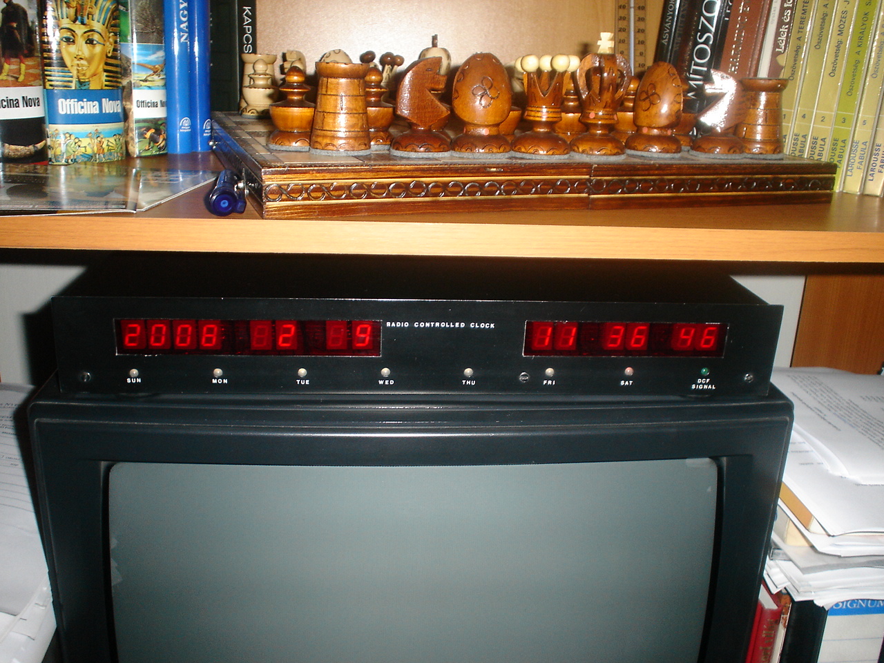 Mivel tudom, hogy kis közösségünkben nagyon népszerűek a digitális órák, a DCF-vezéreltek nemkülönben, közkinccsé teszem egy majd' 20 éves alkotásom: Viletel Istvánnak a Rádiótechnika 1987/2-es számában megjelent cikke alapján megépítettem a 8748-as mikorvezérlővel felépített rádióvezérelt órát. Annyiban változtattam a felépítésen, hogy az ott szerepelttől eltérően az enyém évszázadtól másodpercig, a hét napját is kijelezve mutatja a pontos időt, és nem az ott közölt vevővel dolgoztam, hanem egy conrados panelhez készítettem saját rezgőkört egy óriási ferrittel, ahogy a képeken is látható, mert felénk elég gyenge a vétel. A doboz alumínium lemezből készült, a Scönherz Kollégium RT-műhelyében, boldogult mérnökhallgató koromban csináltam, aztán mattfekete spray, Alphaset... A panelek fotoeljárással készültek, érdekességük, hogy a Pozitív-20 felvitele után a levilágítás úgy történt, hogy a fóliás alaplemezt a maszkkal együtt felragasztottam a kollégiumi ablak külső felére, ott maradt pár órát, és már kész is volt. A vevőegység a tetőtérben, a vasbeton födém felett működik, telepes táplálással, míg az óra a földszinti nappalink dísze, a kettőt koax köti össze, ami a falban van felvezetve, régen központi antenna céljára szolgált, de elkoboztam. No, enjoy