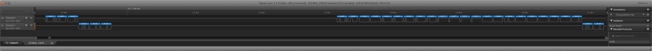 - először kimérem logikai jelanalizátorral, mert a szoftver hiba sem kizárható, nem a standard firmware fut rajta