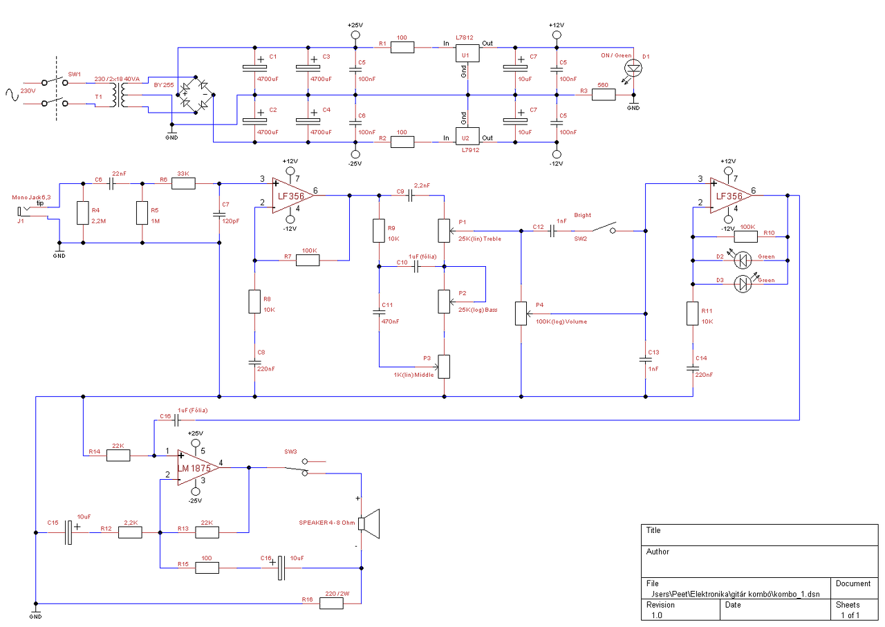 Tök jó lesz ez neked! Tanulni, elsőre ideális, van benne torz lehetőség is. alaposan megfigyeled itt is hangszóró arammal arányos a visszacsatolás, csak itt durvább jóval, én azért kicsit szerényebben lőném ezt be, így első blikkre én garantálom a nagyfrek gerjedést! (Ilyen suhogó, sustorgó hang a hangszóróból...én is durvultam az elején, LM3886-al kísérleteztem, olyan gyönyörű 10Mhz es szinusz jött le a kimeneten, hogy ihaj, ha akartam volna, tuti nem sikerül...alap szabály: erősítőt akarsz, begerjed, oszcillátort, akkor az életben be nem indul... ) Itt azért van külön gain, hogy a torzítást meg tudd lökni, és a volume-val levenni a hangerőt. Tök jó, tök egyszerű, ha a kapcsolót átkötöd a normal állásnak megfelelően és a ledeket pl be sem ülteted, akkor még a csatorna váltással sem kell bíbelődnöd, lesz egy sima tiszta erősítőd. Ettől a torz csatornától sokat ne várj..Jó munkát, sok sikert, majd mutasd meg az eredményt! Szendi001- nek újfent köszönet a rajzért.