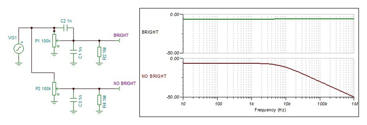 Mivel én rajzoltam neki, engedd meg, hogy megmagyarázzam...mivel egy fenderből lestem a csatolókat, csak leskáláztam, nem kell megaómokkal operálni, ha lehet a 10edével is, a kapacitások nyilván 10x akkorák lettek. A gain poti eredetileg 1M volt, 100pF bright-al. Az őt követő triódás fokozat miller kapacitása nyilván terheli a poti csúszka-földet, megegyezhetünk abban, hogy az jóval több is 100pF nél a szerelési kapacitásokkal együtt. Ha a bright nincs bekapcsolva, akkor tompább ,mikor benn van, épp kompenzálja...mi ezzel a baj?