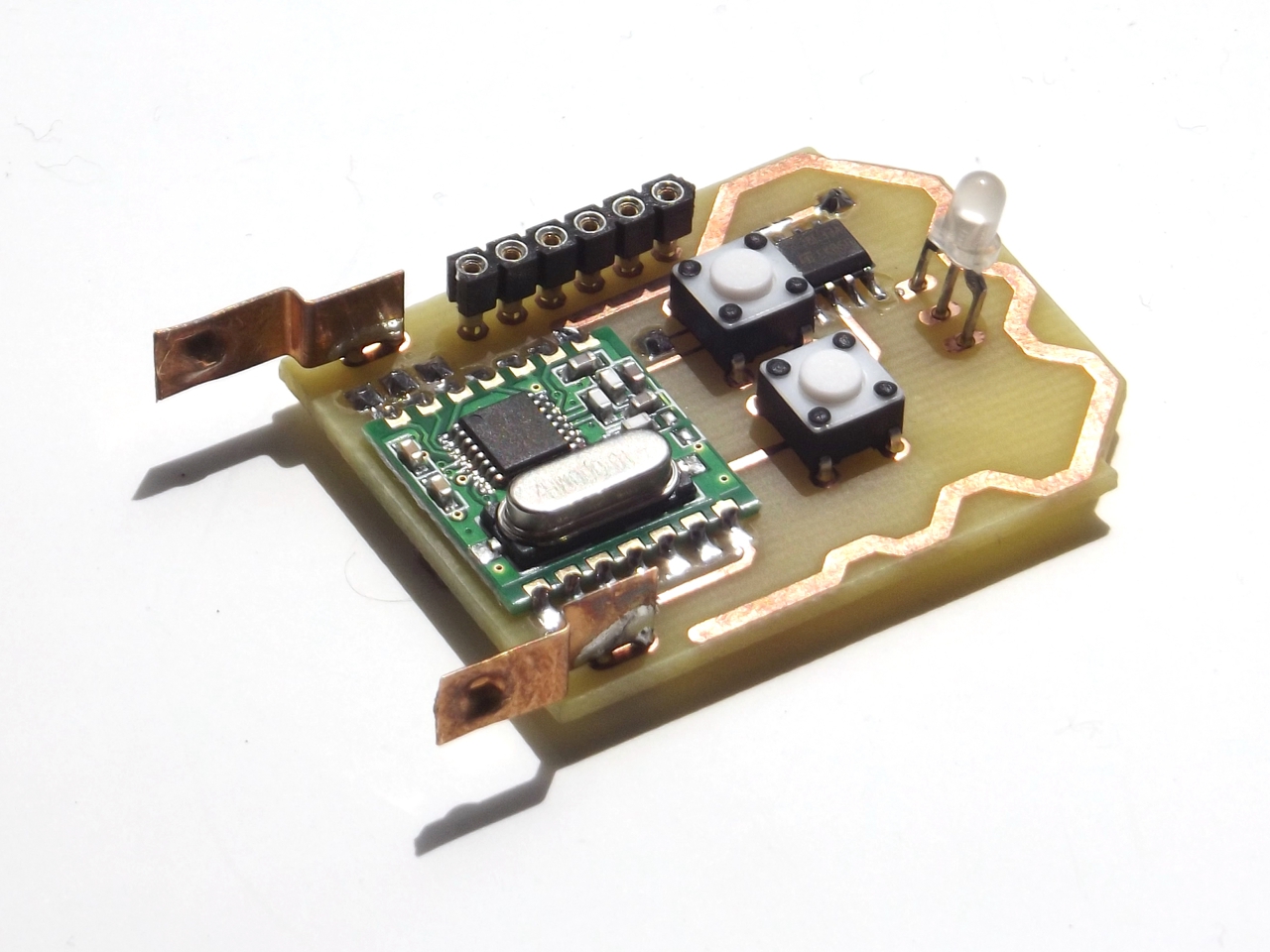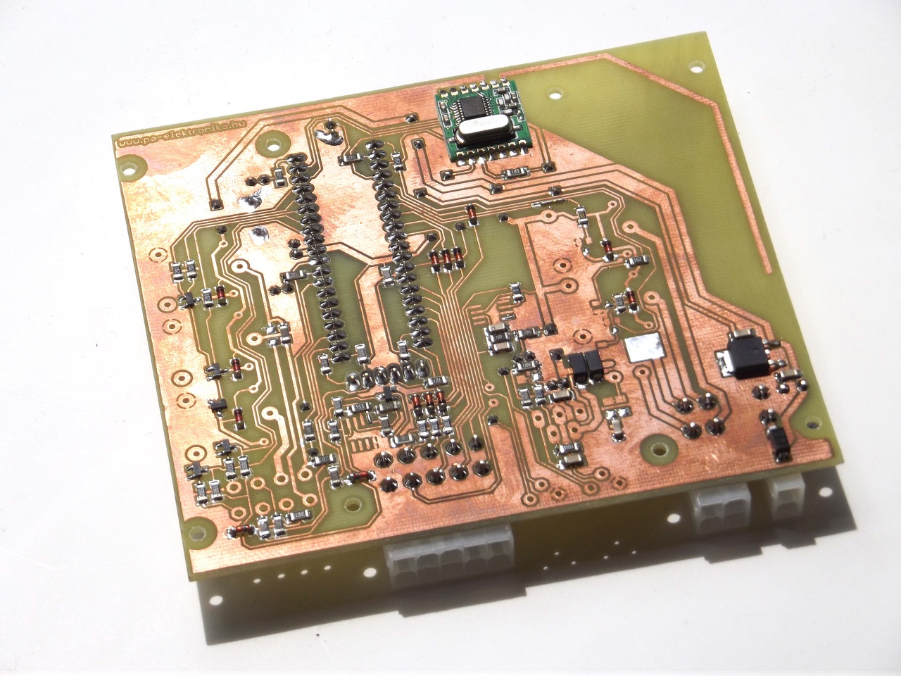 Úgyhogy átterveztem az egészet RFM12B modulra, ez is adó-vevő egyben, viszont 868MHz-es. Ez már nagyon szuper, több száz méterről is tökéletesen működik, falakon és vasajtókon keresztül. A végleges változatban ezért szoftverből beállítom hogy direkt kisebb jellel sugározzon hogy csak az autó néhány méteres körzetében működjön. Mivel az RFM73-al ellentétben ennek a modulnak már nincs saját antennája, ezért azt nekem kellett megoldanom. Ilyen cikk-cakkosan fért csak rá a kis panelra. ![]() Sajnos undorítóan néz ki mindkét panel tudom, ezért elnézést is kérek de nem volt kedvem se TN160-ozni, sem lemosni a gyantát hígítóval. Ez amúgy is csak prototípus, nálam így néznek ki a deszkamodellek. A vezérlő panel (ami az autóba kerül) az ráadásul igen szellős mert a háromnegyede nincs is beültetve. Működik már az oda-vissza kommunikáció, a titkosítások, hibakeresés és hibajavítás, minden. ![]() Már csak olyan primitív dolgokat kell beleírni mint relék meghúzatása, index-villogtatás, ajtónyitás-érzékelés, sziréna működtetés meg hasonlók. Az RFM12 modul kommunikációjához képest azok már faék egyszerűek...