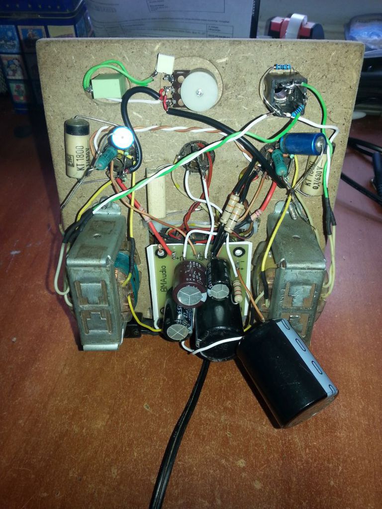 Kéne csinálni egy dobozt, kór sasszi, fakeret, de miből legyen a fakeret? Elkezdtem drágábbnál drágább fákat nézni. Aztán mondtam: állj! Ha nem lesz jó, akkor kidobok rá egy csomó pénzt, és díszként nézegethetem, ha már hallgatni nem akarom. Legyen deszkamodell! - Jött a nagyszerű ötlet. Fogtam egy darab farostlemezt, kocsi ki a garázsból, mert ott még nem pusztulok meg a melegtől, aztán faragjunk. Estére kész volt az elektronika. Élesztés: Hatalmas brumm, szinte az egész fejemet rázta a fejhallgató.