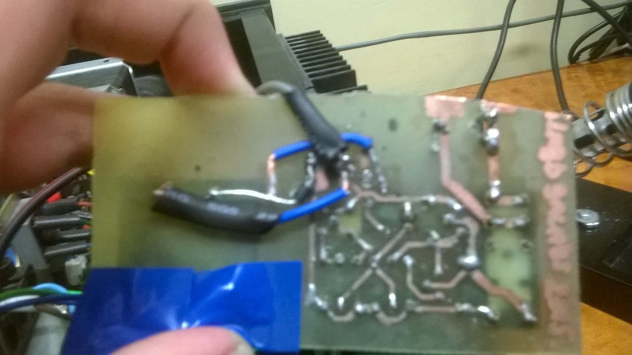 Ez már a 2. Nyák, nem foglalkoztam azzal, hogy lábakra forrasszam a vezetéket, csak fogtam aztán mindent rá a lemezre, időt akartam spórolni a dologgal. Ezért nincsen normálisan megvágva a széle sem.