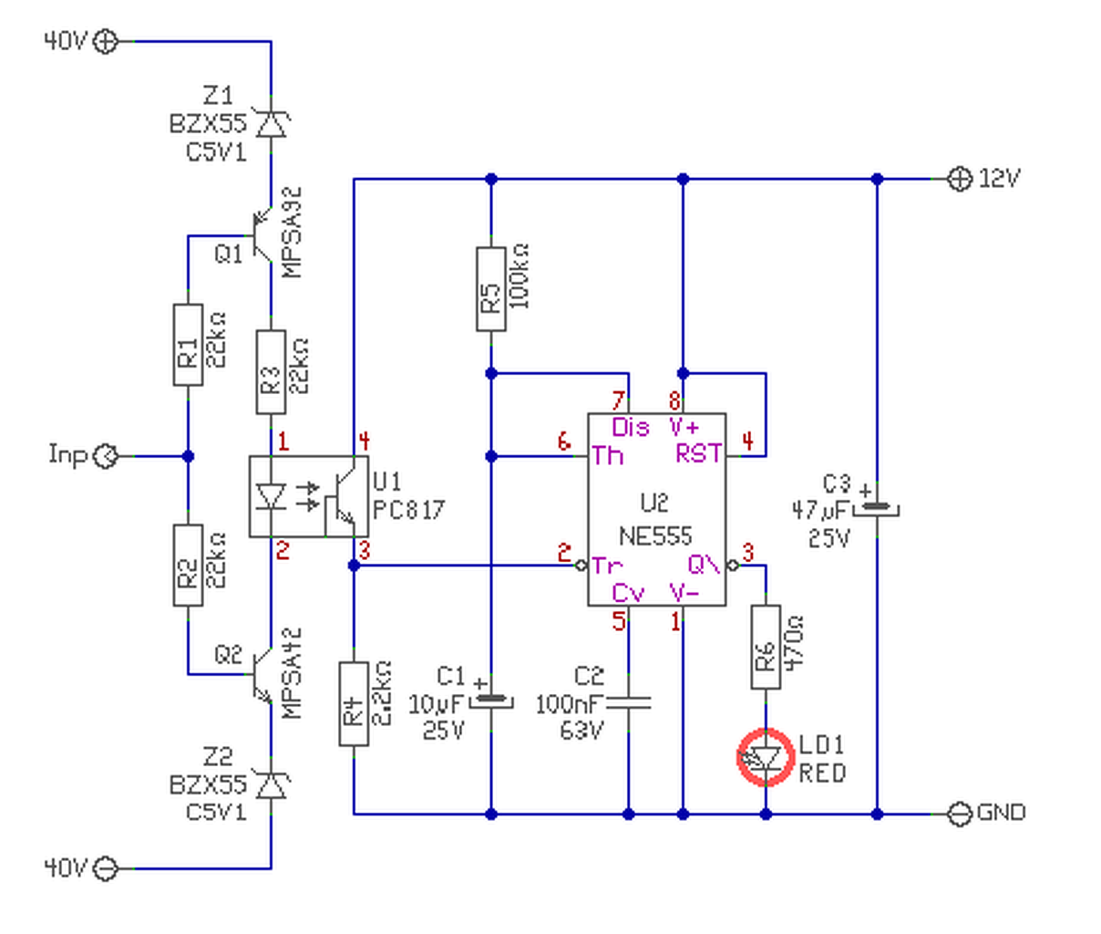 Felteszem ide ezt a kis áramkört, hátha lesz kedve valakinek kipróbálni.. - A CLIP működésbe lépéséhez a zénerek feszültségét kell megválasztani, a végfoknak megfelelően. Jelenleg akkor "szólal meg", ha a végfok kimeneti feszültsége, kb. 5,7..6V-ra közelíti meg vagy a plusz, vagy a mínusz tápfeszt. - A tápfesz értéke nem kritikus, de más táp esetén az R1-R2-R3 ellenállást célszerű a tápfesszel kb. arányosan változtatni. (De nyulat nem lőnek az értékével.) - Az 555 monostabil kapcsolásban működik, így minden "beütés" jelzését meghosszabbítja kb. 1sec ideig. Így egy pillanatnyi túllövés is láthatóvá válik. - A 12V tápfeszültségnem nem kell kötelezően galvanikusan összekötve lenni a végfok tápfeszültségével. - Ha egy Led-el szeretnénk kijelezni mind két végfok túllövését, vagy hidalt erősítő mind két felét figyelnénk, akkor a bementi kőrt kel kétszer megépíteni az Opto-val bezárólag, és az Opto tranyók kollektor-emittereit sorba kötni. - Féltápfeszültséges erősítőt is lehet figyelni, ekkor értelem szerűen a "-40V" pontja a GND-re csatlakozik. Természetesen szokásomhoz híven, én csak kitaláltam, meg nem építettem..