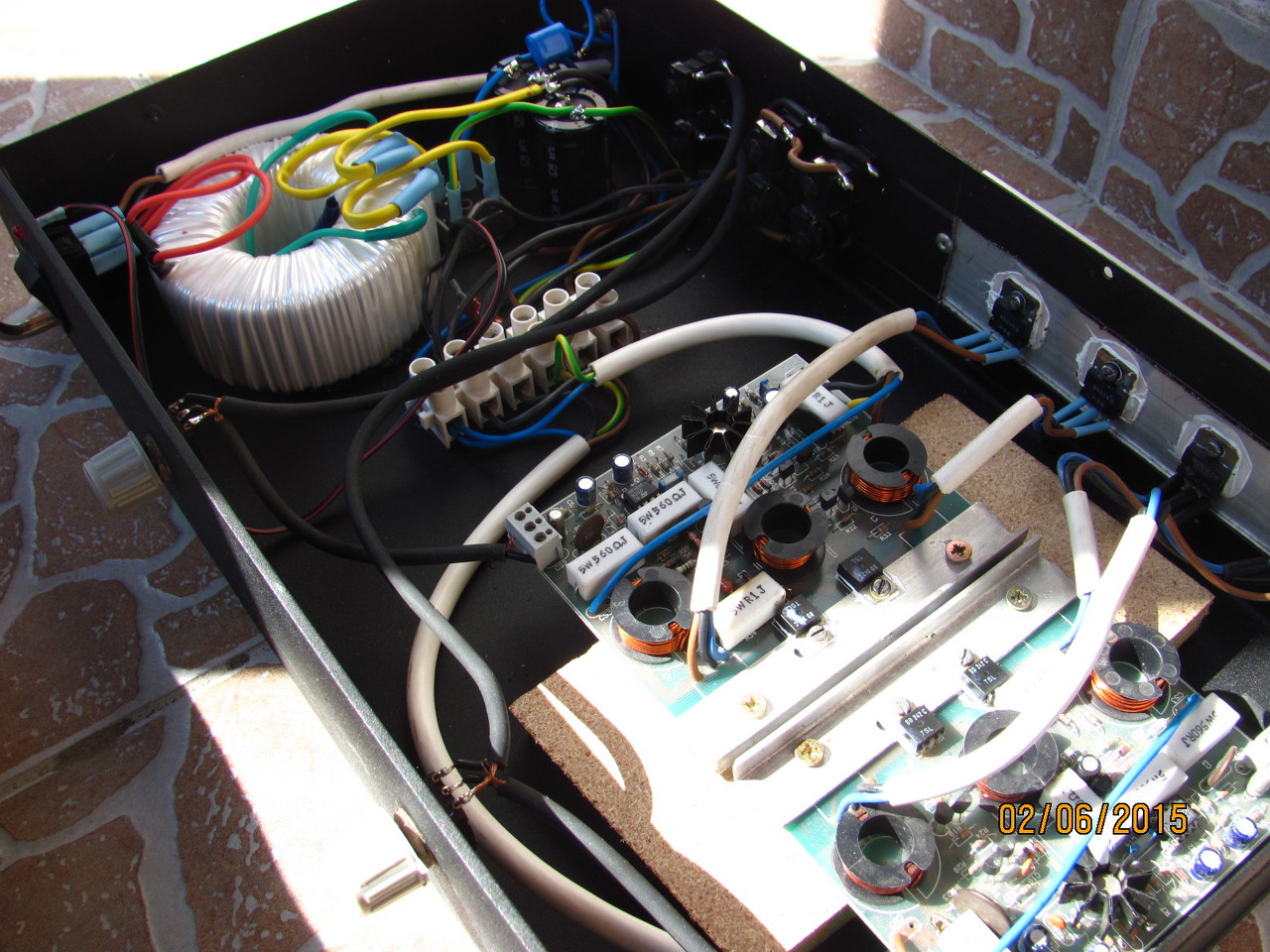 Ez az erősítő szerelés szempontjából egy rossz próbálkozás. A hűtött tranzisztorokat közös bordára kell szerelni és a lehető legrövidebb alkatrészlábakkal. Ehhez képest másfeles MT-kábelekkel van megoldva az elvezetés. Siralmas... Alkatrésznek viszont jó lenne.