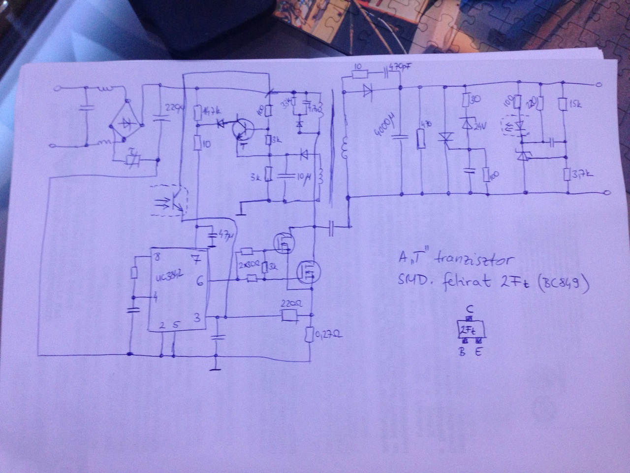 Segítsetek légyszi, mert már végem van ![]() A képen látható kapcsolásról van szó. Tehát, amit ma csináltam: kicseréltem oltocsatolót TL 431et, uc3842-t, a segédtekercsen lévő 10uf-ot. A rajzot többször ellenőriztem, és tuti. Jelenség, ugyanaz. A kimenet 9-11V között ugrál, hallani, hogy az ic nem indul el. Az ic 7 lábán 13V-ot mérek de a 8-as lábon 0 és 0,8V között lambadázik. Ez gondolom azért van, mert nem indul be az ic. Amennyiben a 2Ft tranzisztor C-E ét rövidrezárom, akkor elindul minden, az ic 8 as lábán megjelenik az 5V. Viszont, a kimenet stabilan 17V-ra áll be, de ez sok, mert az optocsatoló led oldali előtét ellenállása melegszik erősen, továbbá a kimenet egyáltalán nem terhelhető. Lezárom 330ohmmal és azonnal összecsuklik. Na erre mondjatok valamit, mert már kezdem magam meseországban érezni. Előre is köszönöm.