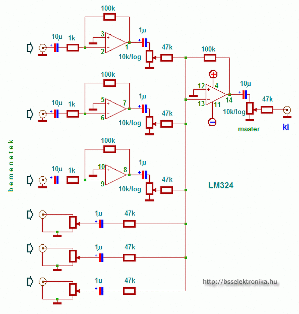 Csak az LM324-et felejtsd el, az komparátor és használható ugyan audio célokra, de igencsak zajos, a torzításáról nem is beszélve. A tranzisztoros kivezérlésjelző pedig elég kiábrándító, mert minél több led világít, annál fényesebb az összes, ugyanis a már kinyitott tranzisztorokon is nő a nyitőáram, ami miatt nő a fényerő (megcsináltam annó).