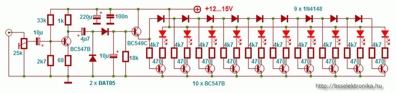 Csak az LM324-et felejtsd el, az komparátor és használható ugyan audio célokra, de igencsak zajos, a torzításáról nem is beszélve. A tranzisztoros kivezérlésjelző pedig elég kiábrándító, mert minél több led világít, annál fényesebb az összes, ugyanis a már kinyitott tranzisztorokon is nő a nyitőáram, ami miatt nő a fényerő (megcsináltam annó).