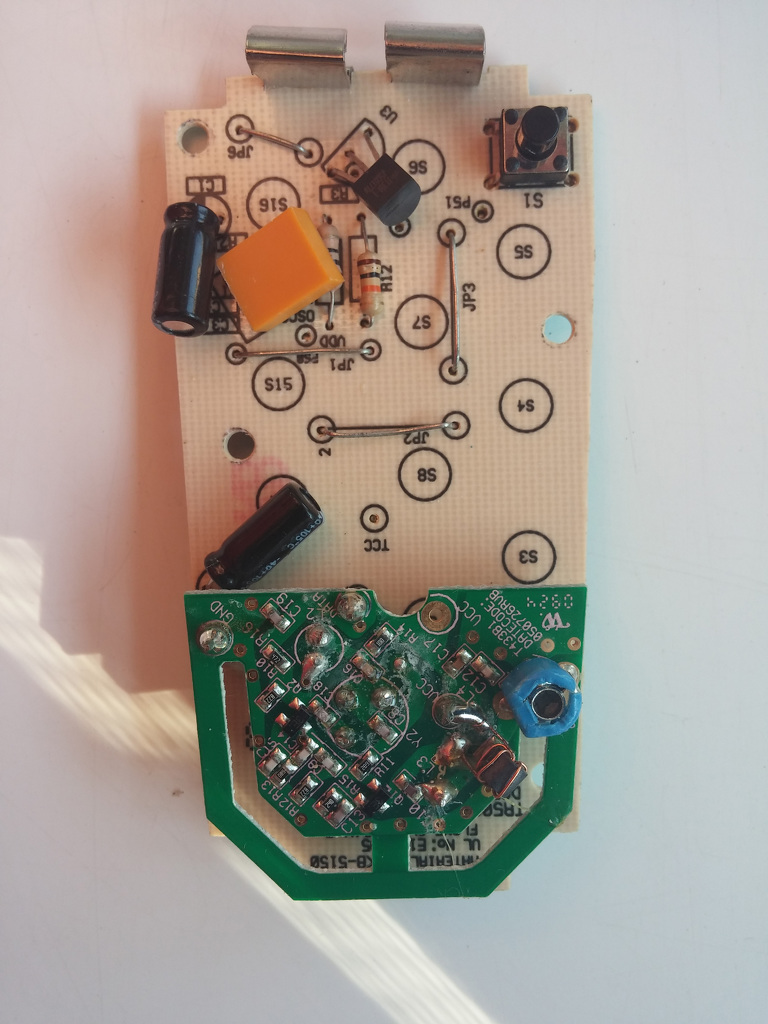 Távirányítású konnektorom van (konnektorba dugható). A távirányítóba elemcserénél a 9 voltos elemet véletlenül fordított pólusokkal tettem bele. Volt egy kis égettes szag mikor kipróbáltam, sajnos valami tönkrement benne. A led fény világít gombnyomásra, de a távkapcsoló nem működteti a konnektort. Van egy másik ugyanolyanom. Ellenállásmérővel összehasonlítottam bennük a kis "vacakokat" (tranzisztorok és egyebek), semmi különbséget nem találtam. Tudnátok segíteni abban, hogy ilyen esetben mi mehetett tönkre? (ha ezt elviszem szerelőhöz, gondolom horribilis összegért vállalja, ha egyáltalán elvállalja) Ha meg tudnám határozni, hogy mi ment tönkre benne, én magam is ki tudnám cserélni. (van forrasztóm) Mellékelek egy fotót. Köszönöm szépen a segítségeteket.