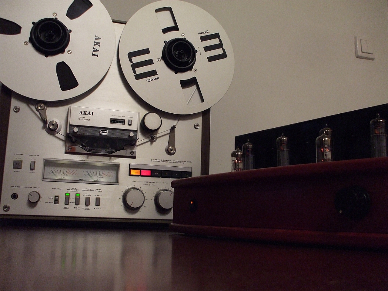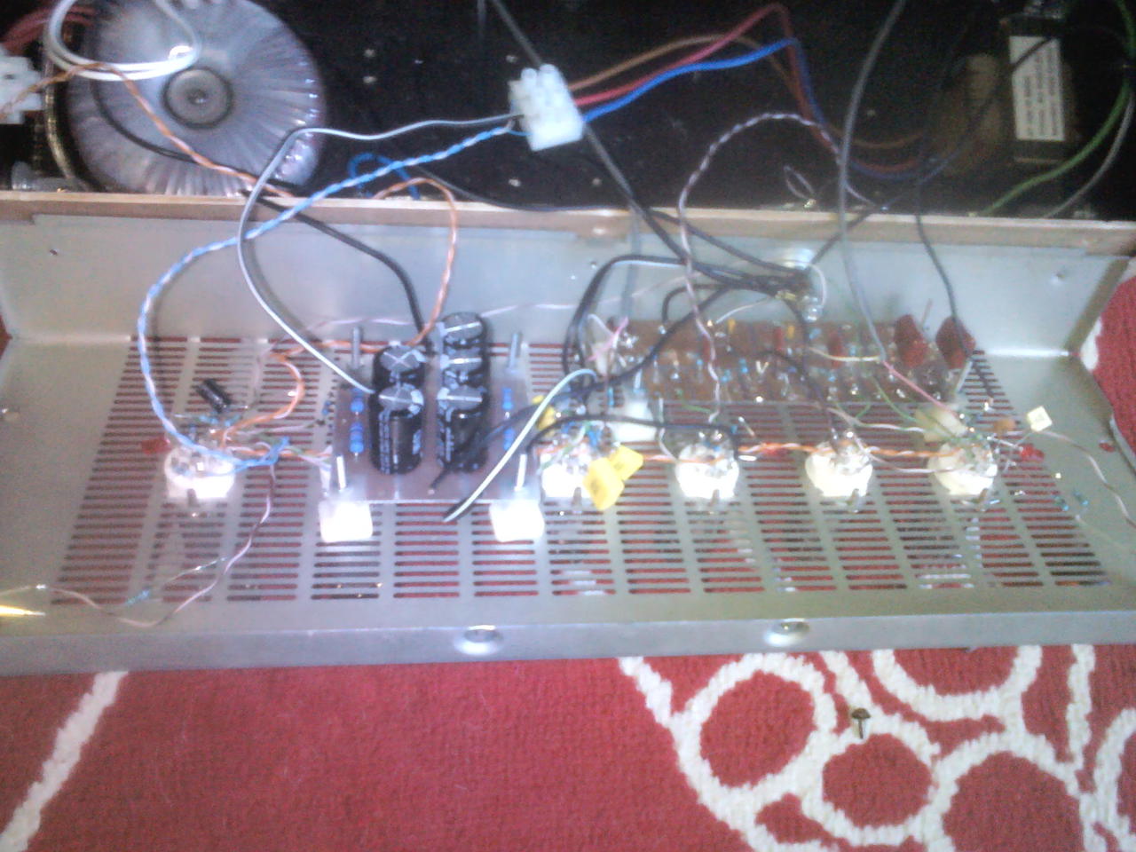 Talán nem említettem a múltkor, hogy amikor először összeraktam a CHZ féle EL84PP-t, bekapcsolás után pár perccel izzani kezdtek mindkét oldalon a jobb oldali EL84-ek segédrácsai. Szólt az erősítő, de nem tetszett a hangja. Szkóppal rámérve kiderült, hogy nagyfrekisen gerjed. A megoldás az lett, hogy a visszacsatolásban eredetileg 1k volt, ezek helyett 11kohmos ellenállásokat tettem, így a bemeneti érzékenység most 450mV lett. Délutáni "csendélet" :